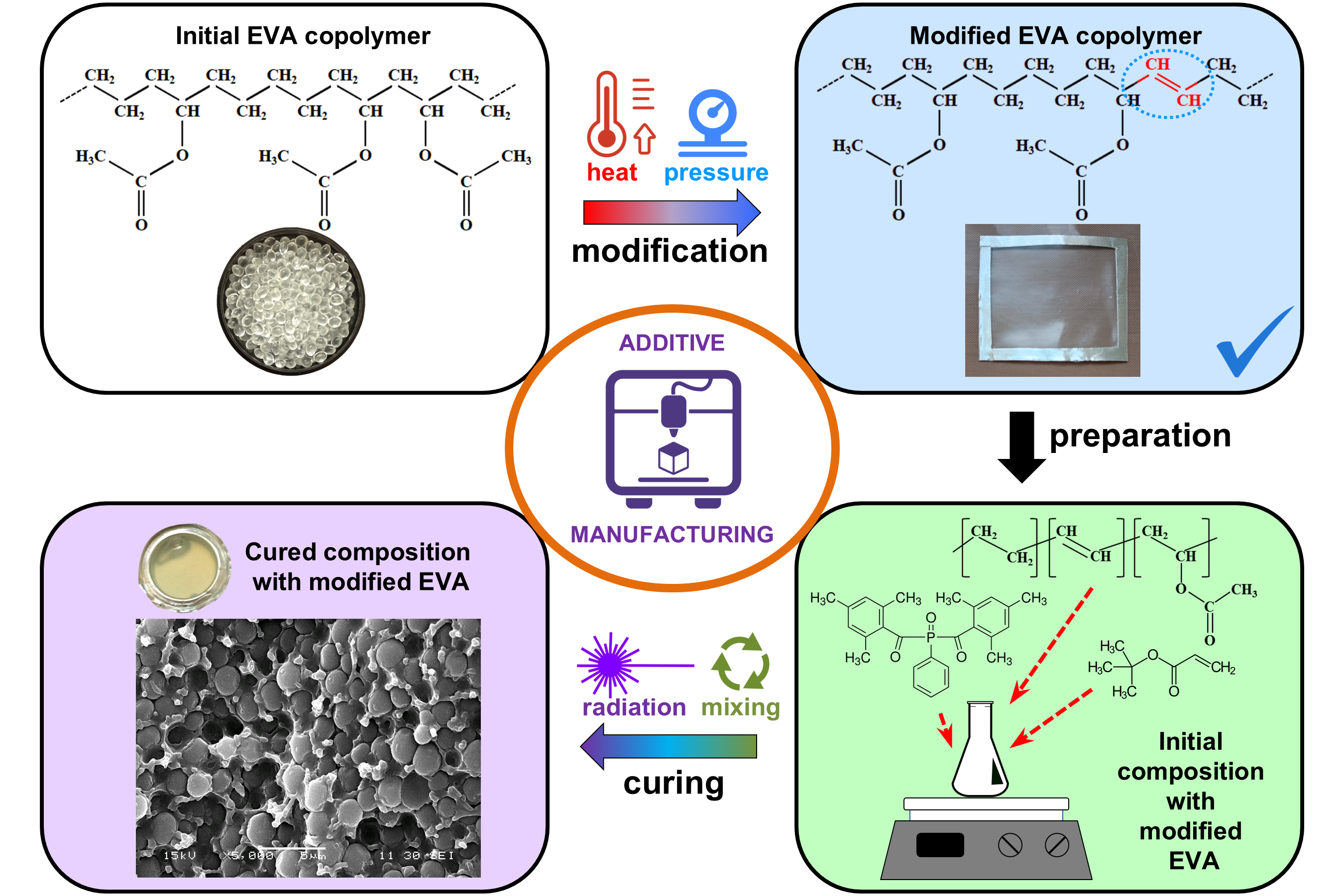 This work tested the possibility of using EVA40 in LPSCs based on acrylates as a complex additive capable of not only being a thermoplastic modifier that improves physical and mechanical properties at low temperatures, but also acting as a thickener that improves the processability of systems, and also acting as an additional crosslinking agent due to the appearance of C=C double bonds after heat treatment.