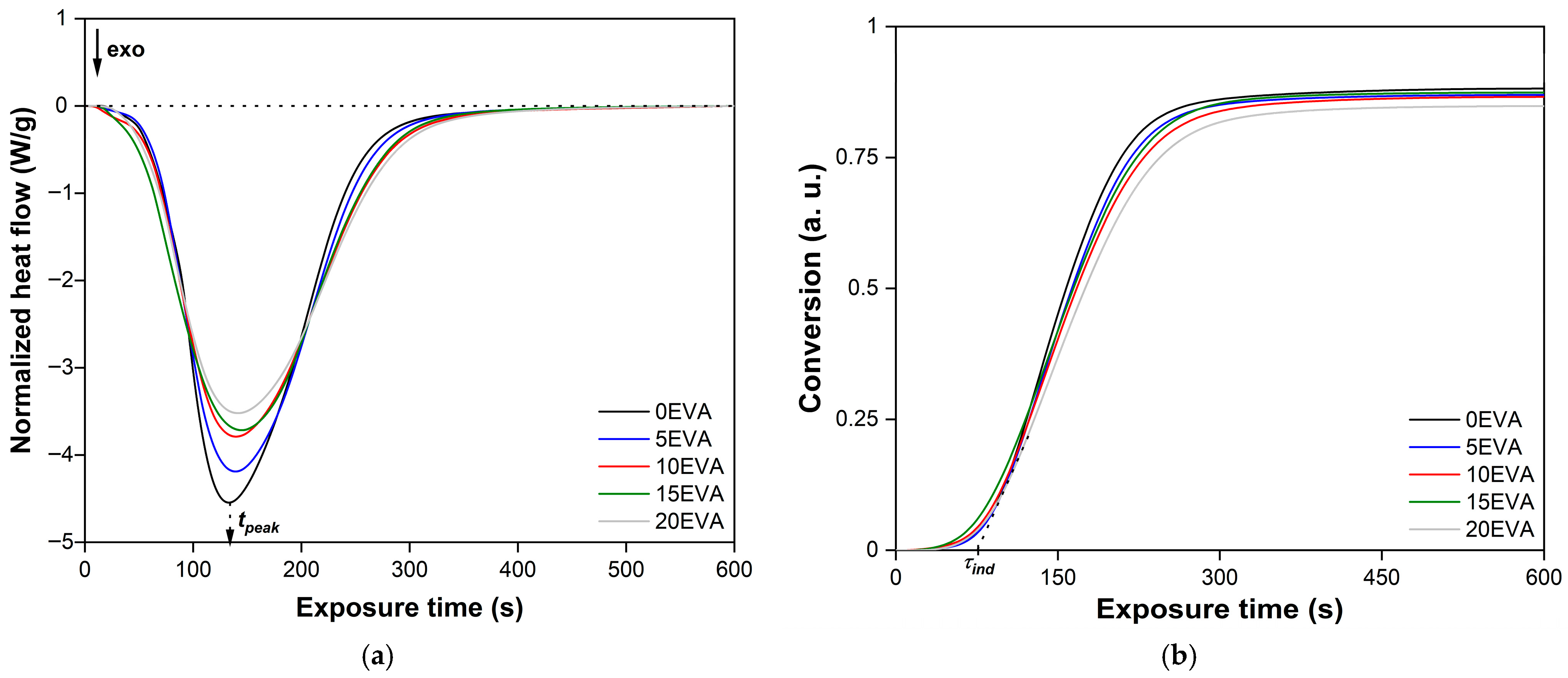 However, since the concentration of thermoplastic modifier m-EVA40 in all MPSCs is relatively low, we neglected, as a first approximation, the contribution of heat from m-EVA40 to the maximum theoretical heat of photochemical polymerization reaction corresponding to MPSC. Therefore, for calculations we used Equation (5) and considered that the kinetics of photocuring (which is usually equal to the kinetics of photopolymerization [32]) of all MSCs is equal to the kinetics of consumption of only the double bond H2C=CH– in tBA.