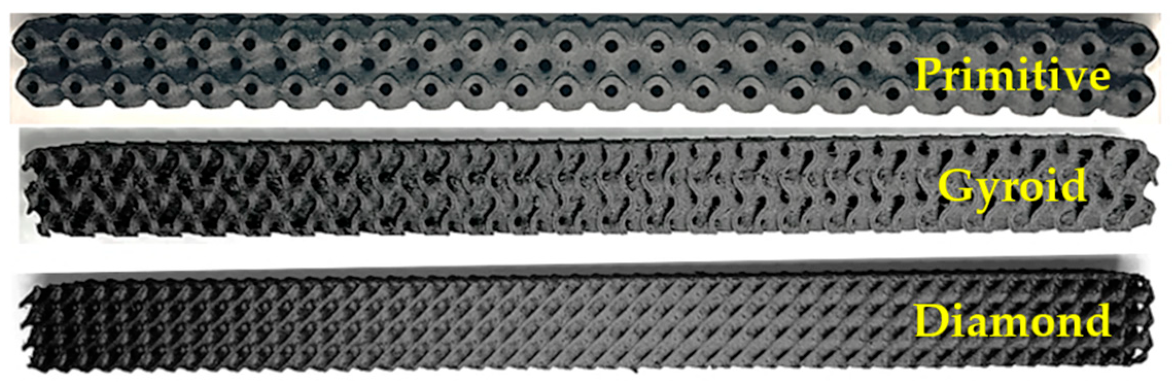 - Based on the research, it can be stated that both Gyroid and Diamond structures appear to be suitable static energy dissipators and the choice of structure will depend on the application and the area in which energy absorption is required (i.e., whether it is a stress area up to maximum load or to total failure). The damping properties during oscillation or impact will be verified and compared in the authors’ research in the near future.