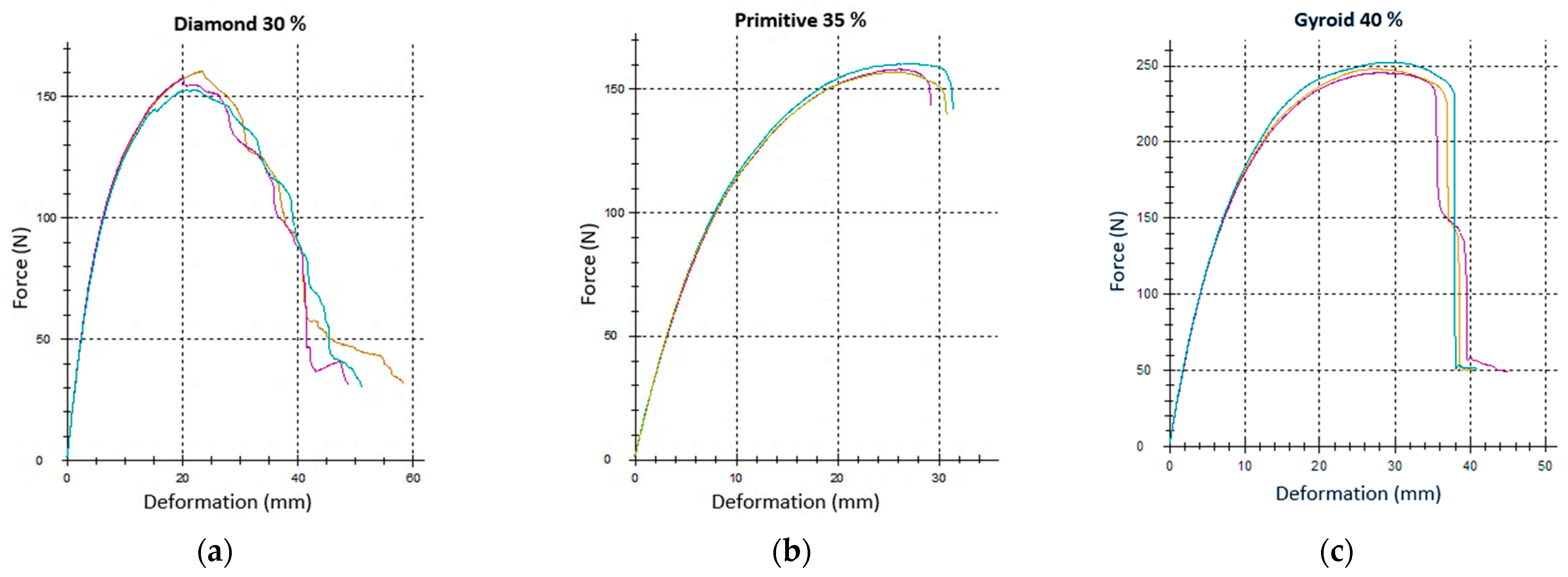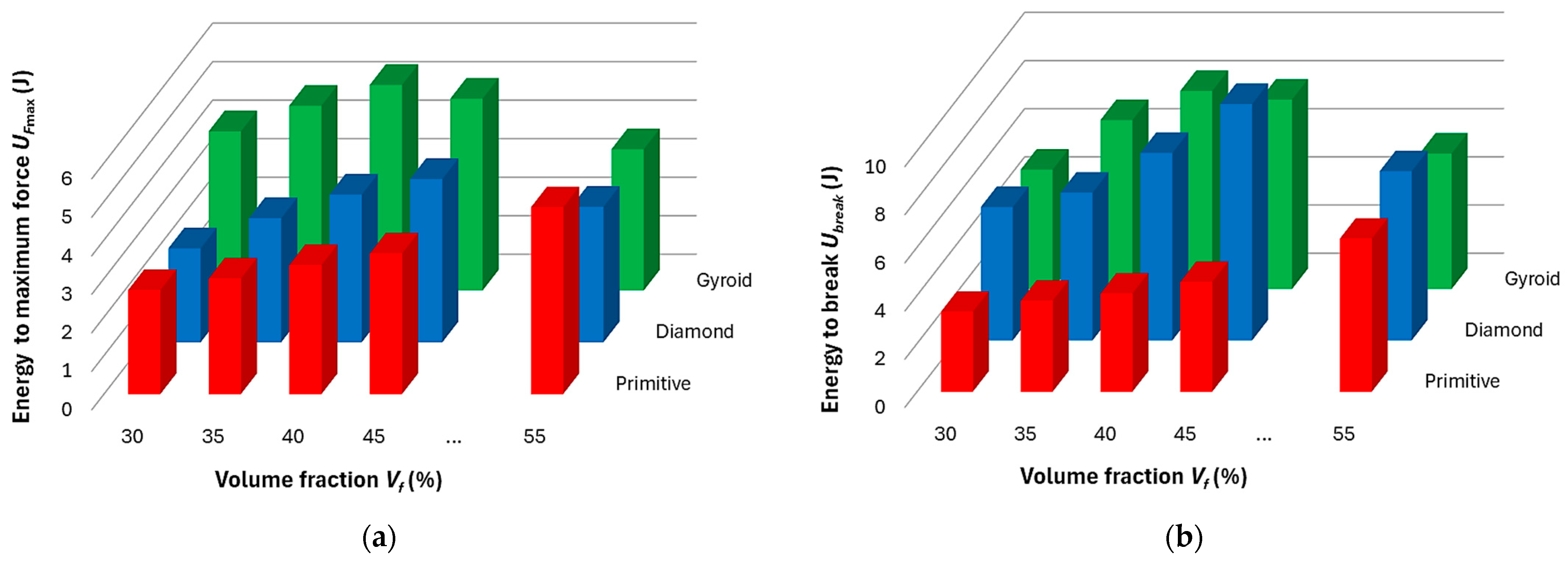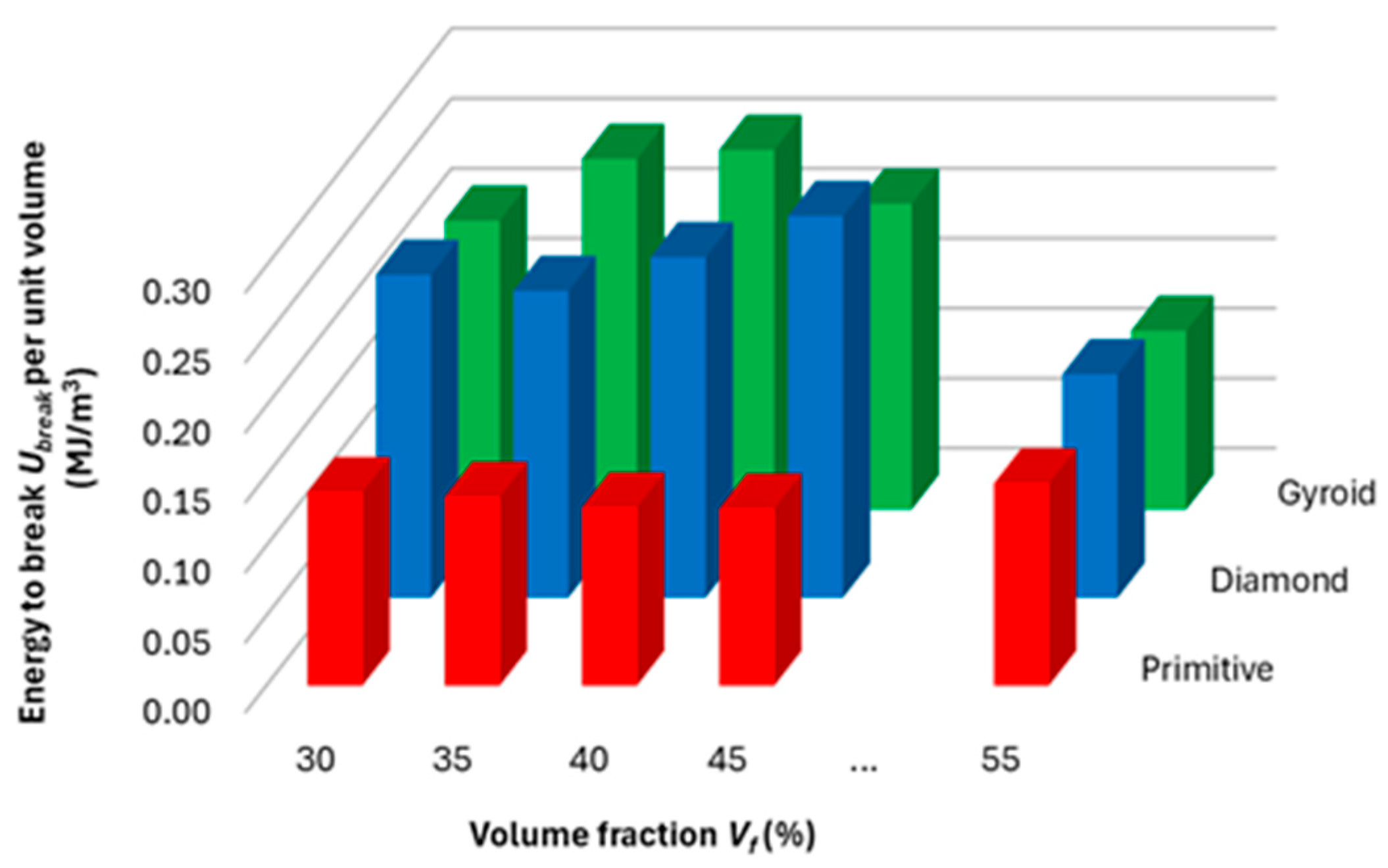 - Until reaching maximum force, the Gyroid structure is best able to absorb energy, and in terms of the total energy that the samples were able to absorb until failure, the Gyroid and Diamond structures were comparable; however, the highest values of absorbed energy were achieved by the Gyroid structure at 40% volume fraction, and the Diamond structure at Vf = 45%.
