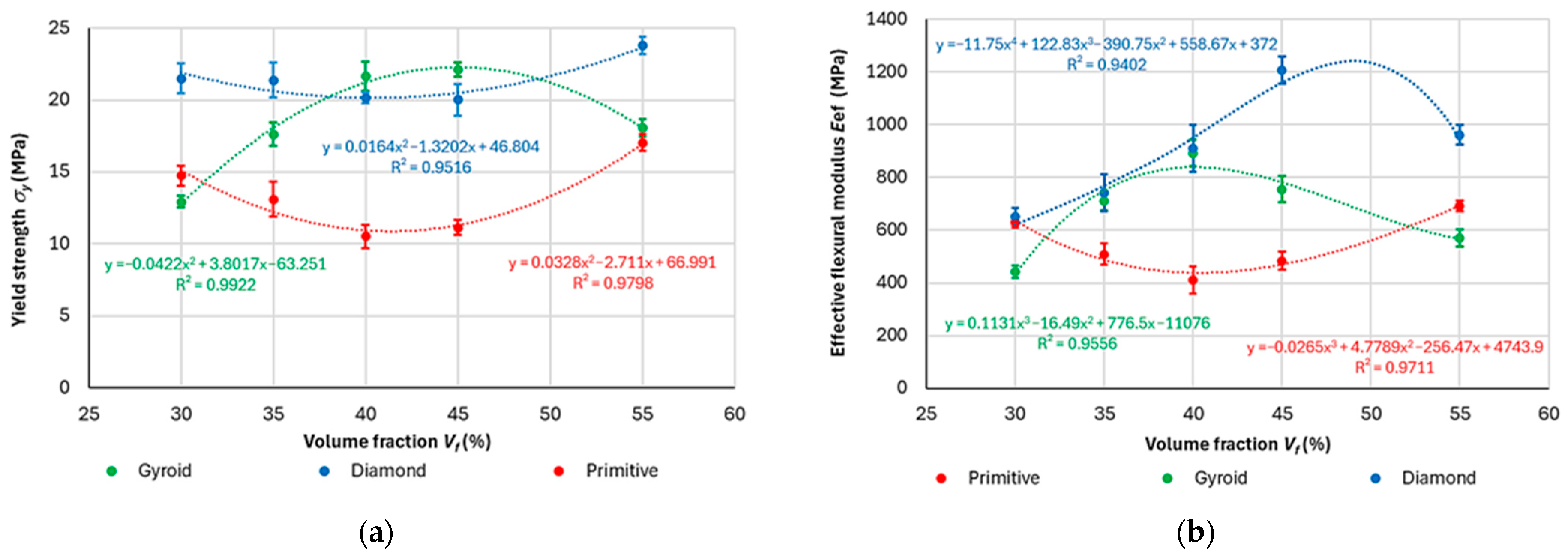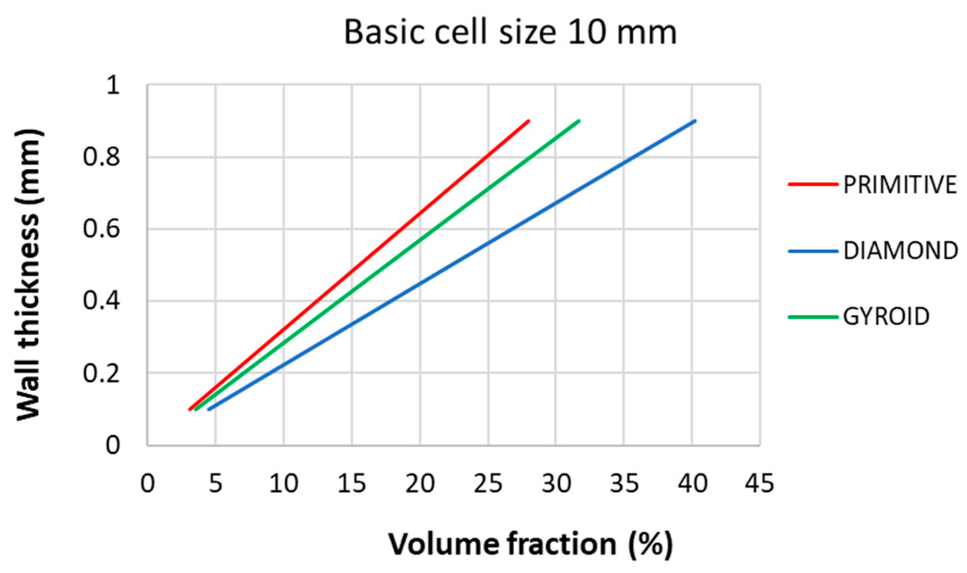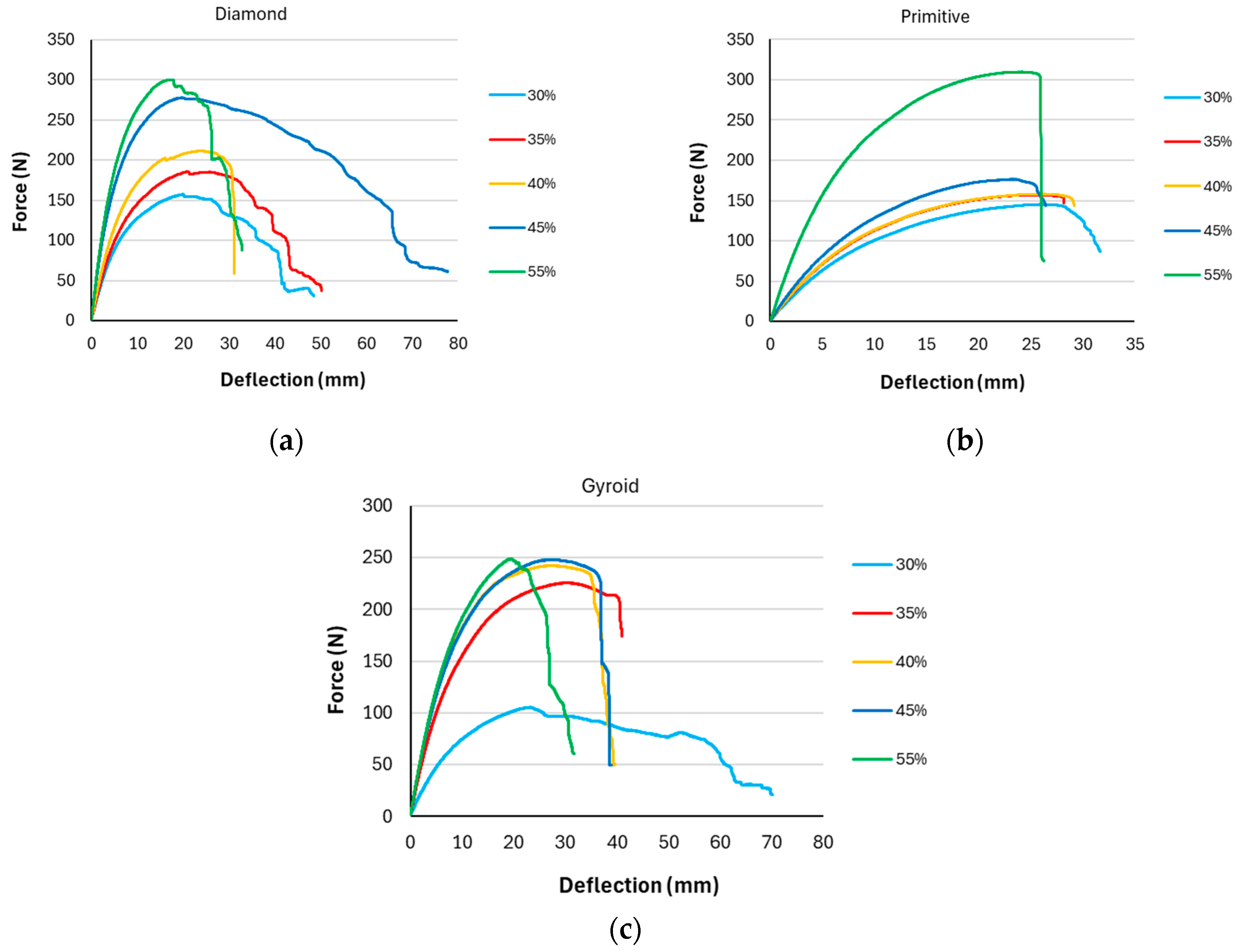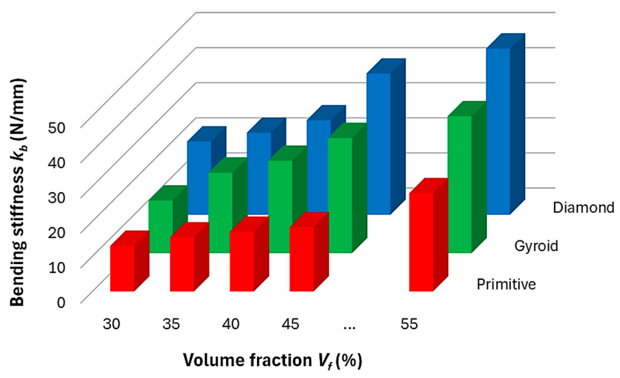 - The stiffness of the structure increased with increasing volume fraction, and the highest stiffness was shown by the Diamond structure with values from 20.9 to 47.3 N/mm, followed by Gyroid in the range of 15–39.3 N/mm, and finally by the Primitive structure with values of 13.2–28.4 N/mm in the investigated volume fraction range of 30–55%.
