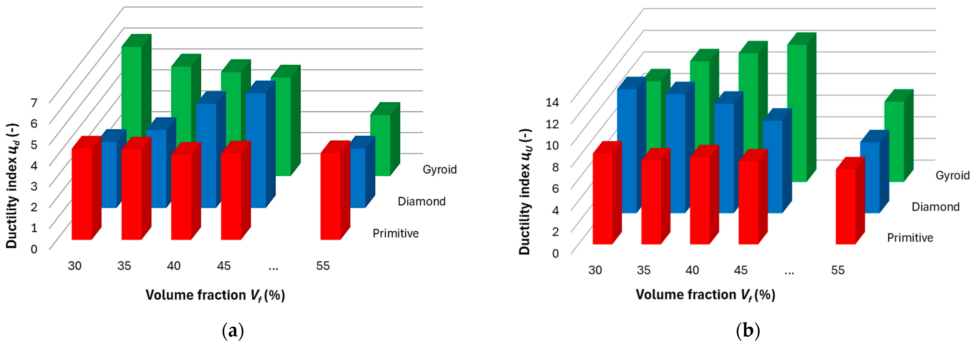 - In terms of ductility, the structures show different behavior. In the area up to the maximum load, the ductility index μd based on deflection shows for the Gyroid structure a decreasing character with increasing volume fraction, and, conversely, for the Diamond structure it increases, while at Vf = 55% a significant decrease was already recorded at the Diamond structure.In the area of the behavior of the samples up to failure, the ductility index derived on the basis of energy has the opposite trend; for the Gyroid it increases with volume fraction and for the Diamond it decreases.The Primitive structure shows stable values with the smallest influence of volume fraction in both ductility indices.