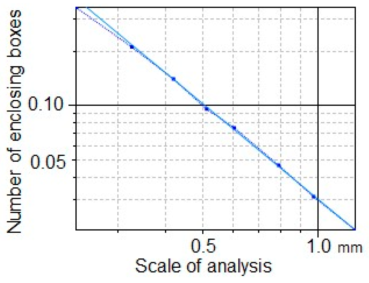 2.5. Coefficient of Determination R2 and Fractal Dimension Analysis
