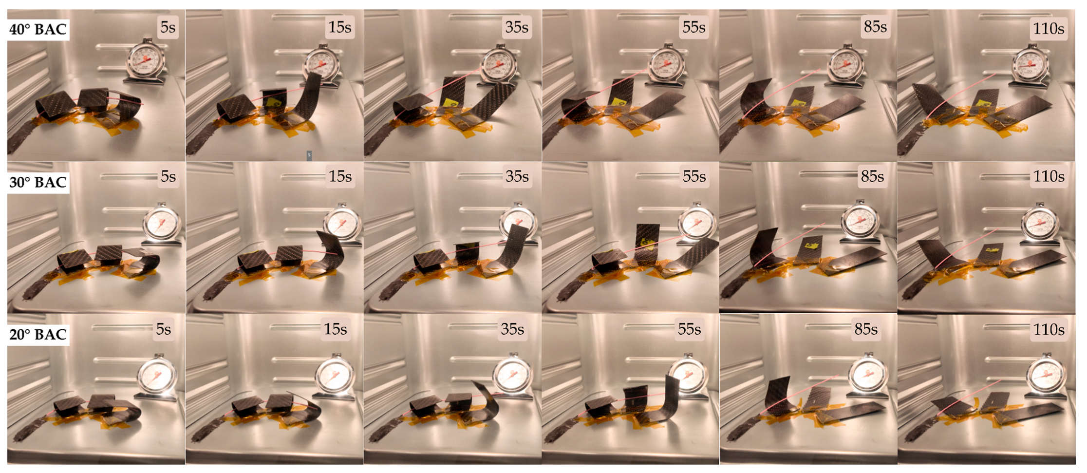 - Li, F.; Scarpa, F.; Lan, X.; Liu, L.; Liu, Y.; Leng, J. Bending Shape Recovery of Unidirectional Carbon Fiber Reinforced Epoxy-Based Shape Memory Polymer Composites. Compos. Part A Appl. Sci. Manuf. 2019, 116, 169–179. [Google Scholar] [CrossRef]