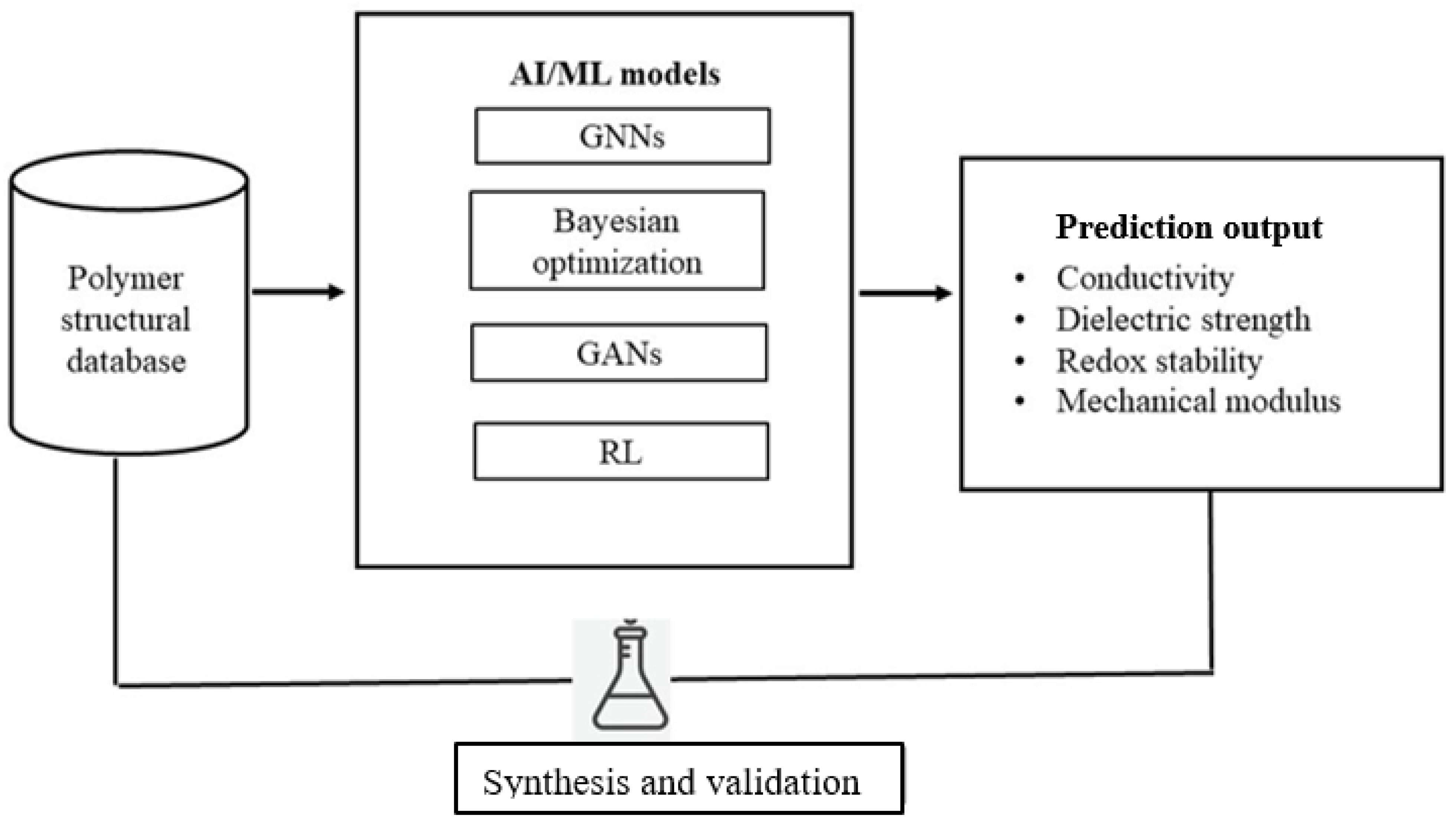 Virtual screening with high throughput using ML has already been used to discover candidate backbones with optimized ion transport pathways of lithium polymer electrolytes and predict polymer chain motifs that enable a high dielectric strength. Simultaneously, generative adversarial networks (GANs) and Bayesian optimization algorithms develop new polymer structures with desired mechanical capabilities and redox potentials. Such predictions with AI are then verified with automated synthesis as well as in situ characterization and generate a closed-loop design pipeline, which continuously enhances model fidelity [