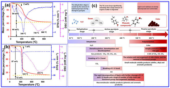 Pyrolysis represents a critical step in transforming lignin into C-based materials and has been the subject of extensive research [41,51]. The behavior of lignin during pyrolysis is influenced by a range of parameters, including annealing temperature, lignin source, heating rate, pyrolysis atmosphere, and the presence of catalysts [55,56]. This section primarily examines the general pyrolytic characteristics of lignin with a specific emphasis on the influence of annealing temperature.