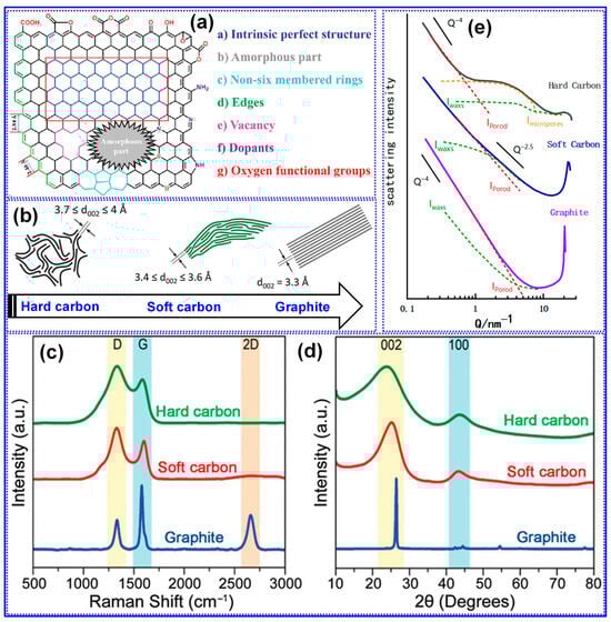 (a) The composition of HC microstructure. Adapted from [25]. Copyright 2024, Royal Society of Chemistry. (b) A visual glimpse into the intricate microstructures of three distinct C forms. Adapted from [66]. Copyright 2018, Wiley VCH. (c) Raman and (d) XRD. Adapted from [5]. Copyright 2021, Wiley VCH. (e) SAXS spectra of three distinct C forms. Adapted from [68]. Copyright 2022, MDPI.