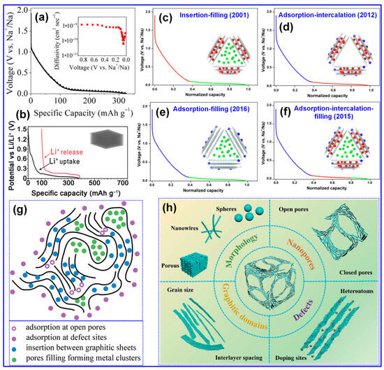 A comprehensive understanding of the Na storage mechanism is imperative for the rational design of HCs with improved energy densities [20,69]. Nonetheless, the inherently disordered structure of HCs has rendered the exact Na storage pathway ambiguous and contested, thereby hindering the optimization of HC-based anodes [68]. In contrast to the straightforward Li intercalation in graphite, Na storage within HCs manifests a more intricate behavior [70]. As depicted in Figure 5a,b, the voltage profiles of Li in graphite and Na in HCs diverge significantly; HCs display a gradual slope above 0.1 V and a distinct plateau beneath this threshold [5,71]. To interpret these phenomena, multiple conceptual models have emerged since Stevens et al. proposed the seminal “house-of-cards” and “insertion–filling” paradigms [72]. Evolving perspectives have introduced the “adsorption–insertion,” “adsorption–filling,” and the composite “adsorption–insertion–filling” models (Figure 5c–f) [17]. Recent advances, enabled by sophisticated characterization techniques, have further refined this understanding into hybrid constructs such as the “four-stage” [73] and “extended adsorption–insertion” models [74]. Despite their differences, these frameworks consistently highlight three principal Na storage mechanisms, surface adsorption, interlayer insertion, and nanopore filling, each fundamentally dictated by the microstructural attributes of HCs [75].