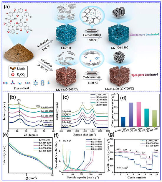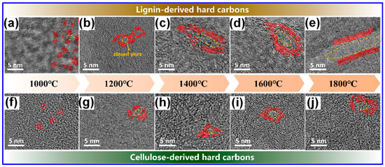 In addition, Lotfabad’s group [98] observed that LHCs typically possess smaller graphitic domain sizes than those derived from cellulose, suggesting cellulose’s greater propensity for forming extended graphitic structures. Complementary findings by Wu and colleagues [58] revealed that under identical carbonization temperatures, LHCs exhibited lower sp2 C content and a higher concentration of defects relative to cellulose-derived HCs. Similar observations were reported by Feng’s group [99], who removed cellulose and hemicellulose from lignocellulosic biomass prior to carbonization, further supporting these trends. Nonetheless, some studies present conflicting results [60,96]. Shang and collaborators [96] proposed that lignin decomposition during pyrolysis and carbonization may facilitate the formation of large crystalline domains, potentially disrupting the random stacking of graphene layers. In a comparative study, Song’s team [100] analyzed the microstructural evolution of HCs derived from lignin and starch. They concluded that lignin-based HCs exhibited fewer structural defects, larger interlayer spacings, and fewer closed pores, whereas starch-derived HCs showed the opposite trends: greater defect density, reduced interlayer spacing, and more closed pores.