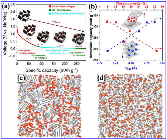 Recent investigations have provided new insights into the Na storage mechanisms within LHC materials. Alvin’s team [42] proposed a comprehensive, multi-stage model that links specific structural features of LHCs to their sodiation behavior across both sloping and plateau voltage regions. This model comprises four distinct stages: (1) initial Na adsorption at defect sites; (2) subsequent adsorption in micropores, occurring primarily within the sloping voltage region (>0.1 V); (3) intercalation of Na ions between graphene layers, corresponding to the plateau region (<0.1 V); and (4) final pore filling within closed pores near the cutoff potential (Figure 9a). Alternatively, Escamilla-Perez and colleagues [101] proposed a different mechanistic pathway based on correlations between reversible capacity and key structural parameters, including interlayer spacing and closed porosity. Their findings indicate that larger interlayer spacing enhances capacity, while increased closed porosity has the opposite effect, thereby favoring an “adsorption–insertion” mechanism (Figure 9b). Complementary insights from Kizzire’s group [102], using reactive molecular dynamics (MD) simulations, demonstrate that Na ions preferentially adsorb on curved graphene surfaces. Moreover, moderate surface curvature and the presence of smaller crystalline domains were found to facilitate more rapid Na diffusion (Figure 9c,d).
