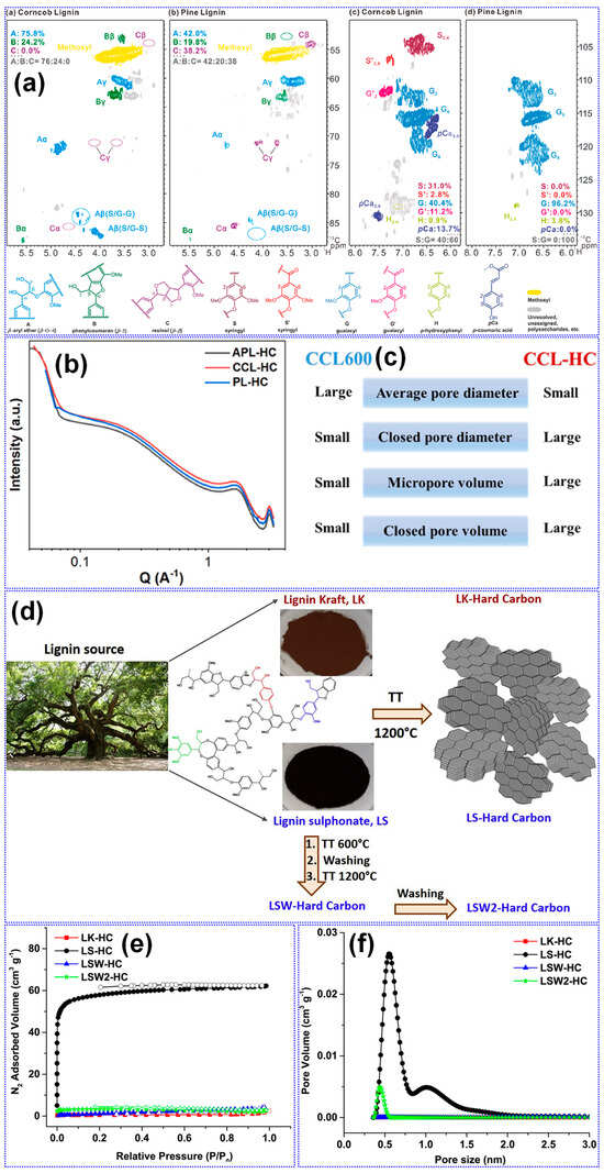 Impact of lignin source on HC structure. (a) Partial 2D NMR spectra highlighting key structural features of lignin and (b) SAXS profiles and (c) pore characteristics of LHCs. Adapted from [116]. Copyright 2023, Elsevier B.V. Impact of extraction methods on HC structure. (d) Schematic illustration of lignin-to-HC conversion process. (e) N2 adsorption–desorption isotherms and (f) pore size distribution of LHCs. Adapted from [89]. Copyright 2019, Elsevier B.V.