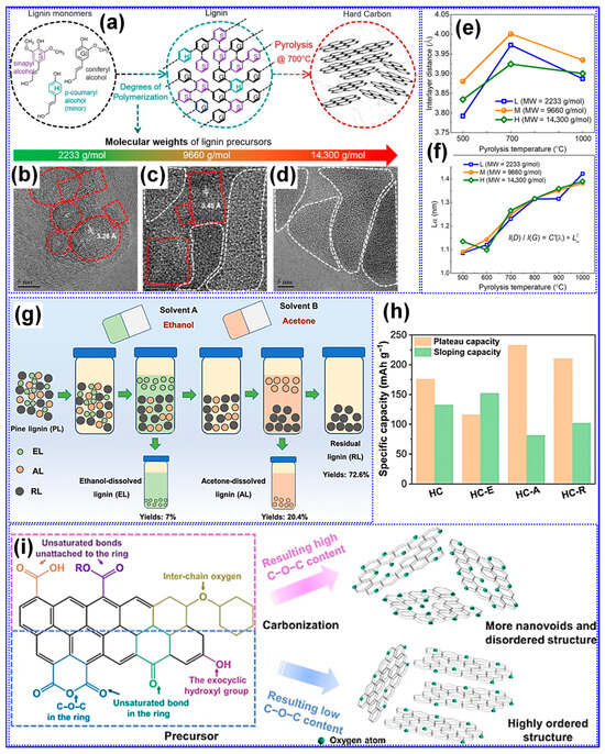 Impact of lignin MW on HC structure. (a–d) Schematic of LHC fabrication and corresponding TEM micrographs. (e,f) Interlayer spacing and nanocrystalline size of LHCs. Adapted from [104]. Copyright 2022, Elsevier B.V. Impact of lignin fractionation on LHC structure and performance. (g) Schematic diagram showing the steps involved in lignin fractionation. (h) The sloping and plateau capacities of LHCs. Adapted from [105]. Copyright 2024, Royal Society of Chemistry. (i) Impact of feedstock O-functionalities on HC microstructure. Adapted from [118]. Copyright 2023, Springer Nature.