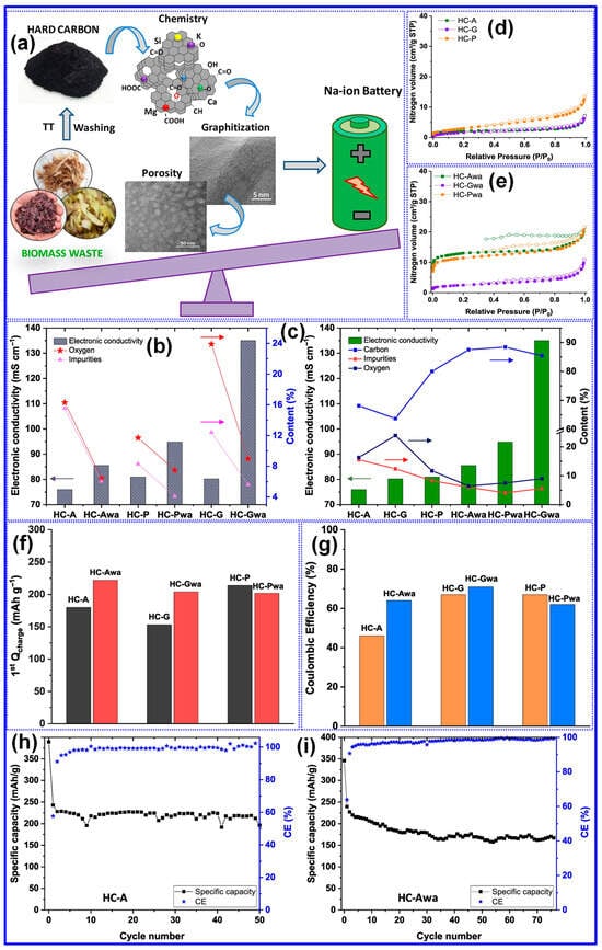 Impact of ash (inorganic elements) on the structure and Na storage performance of HCs. (a) Preparation process. Impact of ash on (b,c) electronic conductivity, (d,e) SSA, and (f–i) Na storage performances. Adapted from [121]. Copyright 2020, Elsevier B.V.