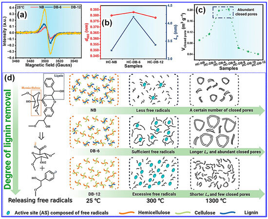 Beyond morphology, the concentration of free radicals within lignin feedstocks plays a crucial role in determining the microstructural evolution of LHCs [126,127]. Wang and colleagues [126] introduced a method to control closed pore formation by tuning the free radical content through selective delignification using ClO2, which cleaves β-O-4 linkages. As the delignification duration increased, so did the concentration of free radicals (Figure 13a). Following carbonization at 1300 °C, the microcrystalline domain size (La) and closed Pv first increased with free radical content and then declined, while the interlayer spacing (d002) remained relatively constant (Figure 13b,c). Moderate levels of free radicals were found to facilitate micropore formation and defect minimization [126]. Mechanistically, radicals enhance pyrolysis and act as intrinsic pore-forming agents, while also promoting microcrystal growth and aggregation, contributing to closed pore formation at elevated temperatures (Figure 13d). Conversely, excessive radical presence led to defect proliferation and hindered pore closure. A subsequent study by the same group employed an activation-based optimization of radical levels, further validating free radical tuning as an effective microstructure engineering strategy for LHCs [127].