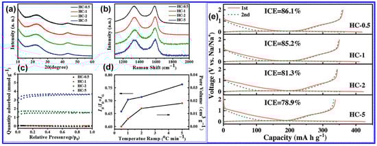 Evaluation of heating rate-dependent properties in HCs. (a) XRD, (b) Raman, (c) N2 adsorption–desorption isotherms, (d) ID/IG and Pv, and (e) the discharge–charge profiles in Na half-cell. Adapted from [128]. Copyright 2018, Wiley VCH.