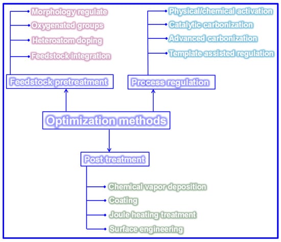 Carbonization remains a widely adopted technique for fabricating LHCs due to its simplicity. However, the direct carbonization approach often falls short in achieving the desired microstructure and Na storage performance, as shown in Table 3. Since the structural and electrochemical characteristics of LHCs are largely governed by the nature of the feedstock and processing parameters, strategies such as feedstock pretreatment, controlled processing, and post-synthesis modification are frequently employed to enhance these characteristics (Figure 15).