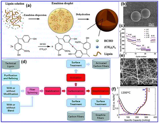Lignin exhibits excellent morphological adaptability, attributed to its polymeric structure and solubility. A wide range of studies have confirmed that C materials derived from lignin can be fabricated into various morphologies such as spheres, fibers, sheets, and 3D porous foams [130,131]. Notably, C spheres stand out as ideal anode candidates for SIBs, offering advantages such as high packing density, low surface area-to-volume ratio, reduced Na+ diffusion distance, and limited defect density. These features collectively suppress SEI formation and promote improved structural integrity and Na storage capacity [131,132].
