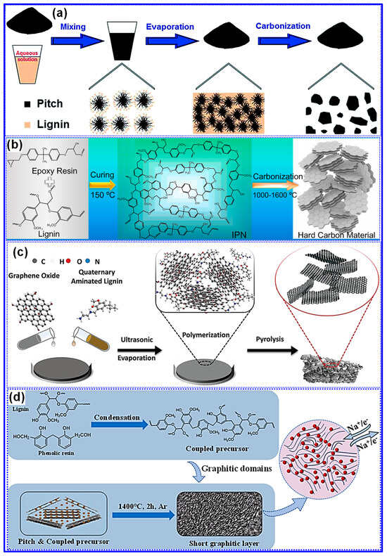 In addition to the pyrolytic reactions described above, numerous researchers have advanced detailed mechanisms and insights into lignin carbonization. Studies by Liu’s and Pandey’s groups suggest that lignin degradation initiates with the cleavage of weaker bonds, specifically hydrogen bonds and C-O linkages, with the scission of β-O-4 bonds serving as the primary trigger for chain depolymerization [51]. Xie and colleagues further underscored the pivotal role of free radical intermediates, particularly those arising from β-O-4 bond cleavage, in facilitating the pyrolysis pathway [8]. A more comprehensive mechanistic investigation by Long and coworkers [59] revealed that lignin carbonization proceeds through in situ decomposition coupled with proximal recombination, while also maintaining that the C atoms largely retain their original electronic configurations and elemental composition throughout the process. Recent results from Wang’s group demonstrated that C crystallites derived from lignin exhibit isotropic arrangements during pyrolysis, contrasting with the anisotropic crystallite alignment observed in cellulose-derived C’s [60]. Moreover, these C crystalline domains have been shown to play a crucial role in guiding the development of graphitic layers in HC materials [61].
