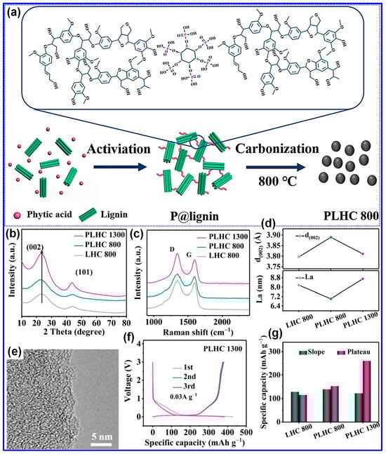 Carbonization temperature is a critical parameter governing the structural evolution and electrochemical performance of LHCs [58,108]. Optimizing this temperature is essential for achieving desirable material properties. As summarized in Table 3, increasing the carbonization temperature generally enhances the lateral crystallite size (La) and stacking height (Lc), while reducing interlayer spacing, structural defects (ID/IG), SSA, and Pv. Correspondingly, the ICE typically increases with temperature. In contrast, specific capacity follows a non-linear trend, rising initially, peaking within 1200–1400 °C, and then declining. Similarly, cycling stability improves with elevated carbonization temperatures, but these trends hold only within a defined temperature window, beyond which deviations may occur.