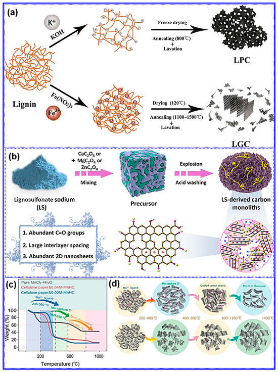Besides, Garcia-Negron’s team [109] systematically explored the influence of water vapor concentration during carbonization on the structural evolution of LHCs. Kraft softwood lignin was pyrolyzed at 1000 °C under a N2 atmosphere with controlled water vapor levels ranging from 0 to 105 g cm−3. While the presence of water vapor exerted negligible influence on graphitic attributes, such as crystallite size and interlayer spacing, it had a pronounced effect on pore development. Specifically, increased moisture content resulted in larger pore sizes, greater Pv, and elevated SSA. These effects are attributed to the occurrence of the water–gas shift reaction at temperatures exceeding 800 °C.