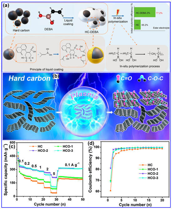 - Yu, C.X.; Li, Y.; Wang, Z.H.; Wang, X.R.; Bai, Y.; Wu, C. Surface engineering based on in situ electro-polymerization to boost the initial Coulombic efficiency of hard carbon anode for sodium-ion battery. Rare Met. 2022, 41, 1616–1625. [Google Scholar] [CrossRef]
