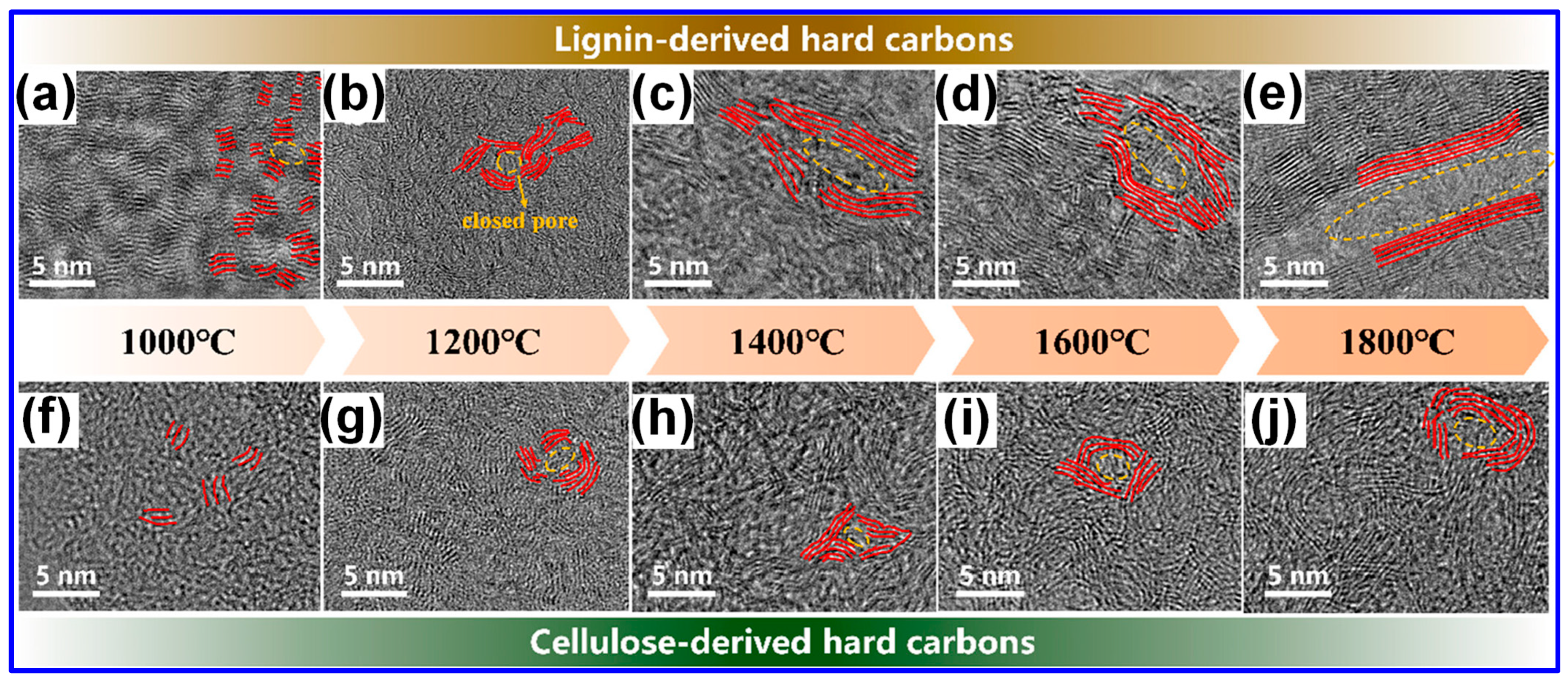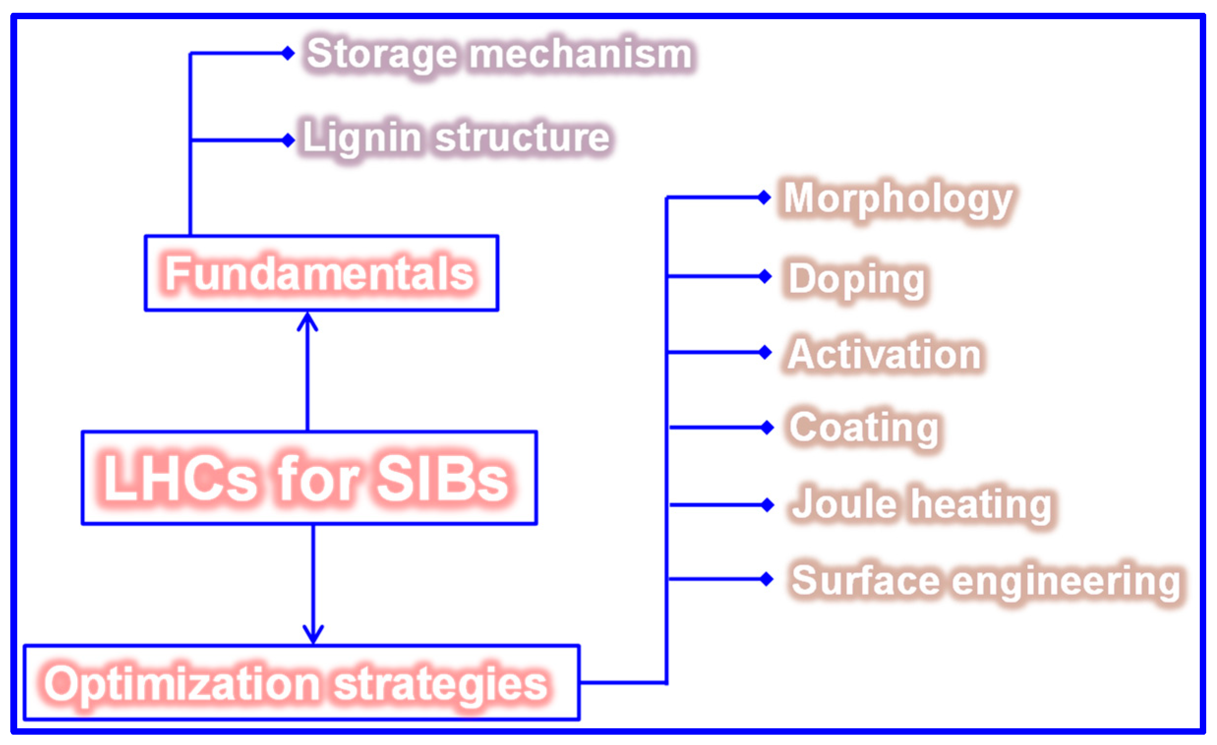 - A deeper understanding of the interrelated “property–structure–performance” relationships in LHCs for SIBs remains crucial yet incomplete. Although correlations between feedstock characteristics and the resulting C structures, and between microstructural features and electrochemical behavior, form the conceptual foundation for rational material design, the fundamental mechanisms governing lignin carbonization are still not fully clarified. Previous studies have examined how specific physicochemical parameters, including molecular weight, O-containing functional groups, and ash content, influence the microstructure of LHCs. However, the primary factors dictating microstructural evolution remain ambiguous. Moreover, the exact contribution of distinct structural motifs to Na storage processes has yet to be conclusively established, hindering the systematic optimization of LHC performance. Addressing these uncertainties will require the integration of advanced characterization techniques, in situ analytical tools, and multiscale theoretical modeling to unravel these complex interdependencies and enable the rational design of high-performance, application-ready LHC anodes for next-generation SIBs.
