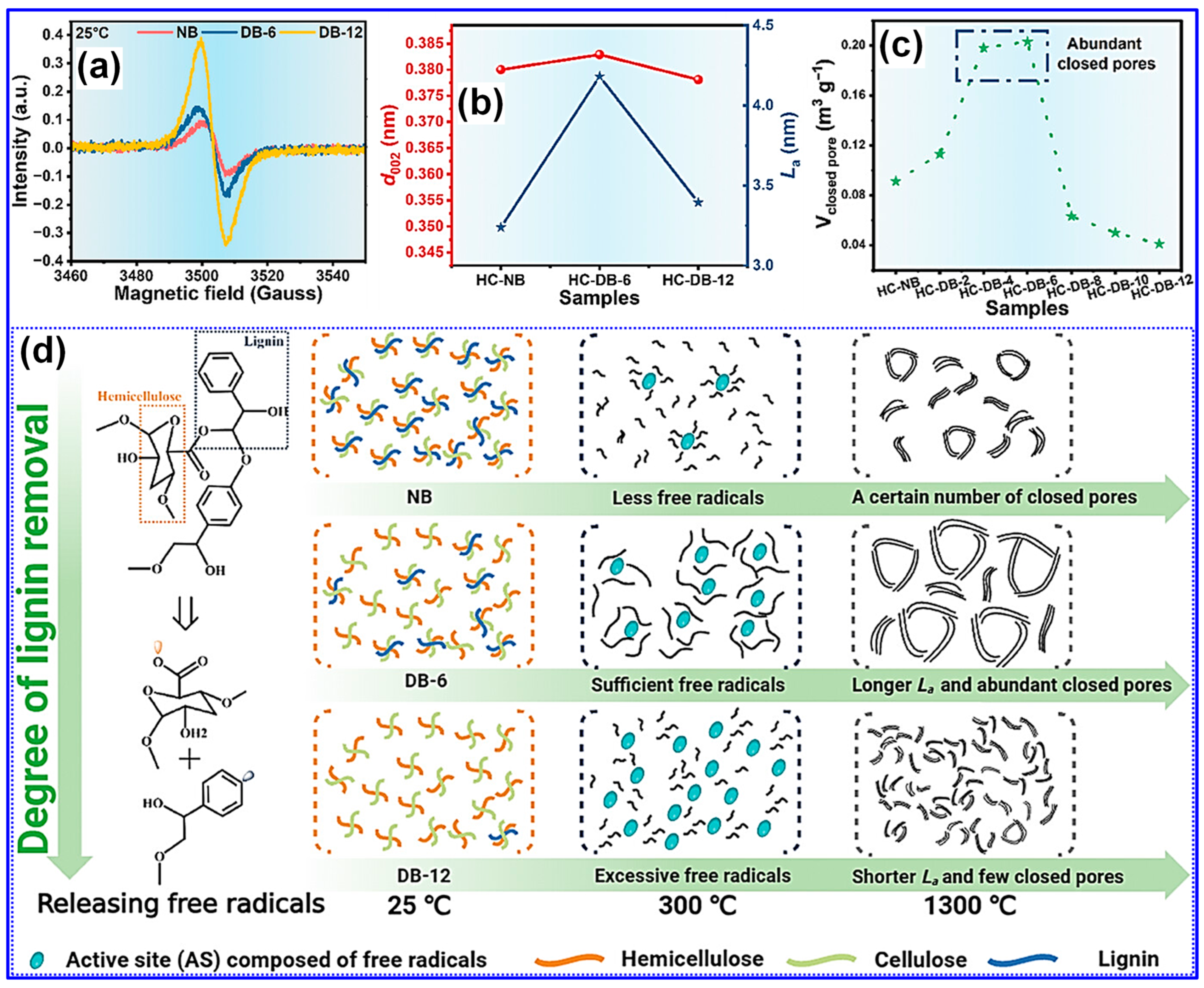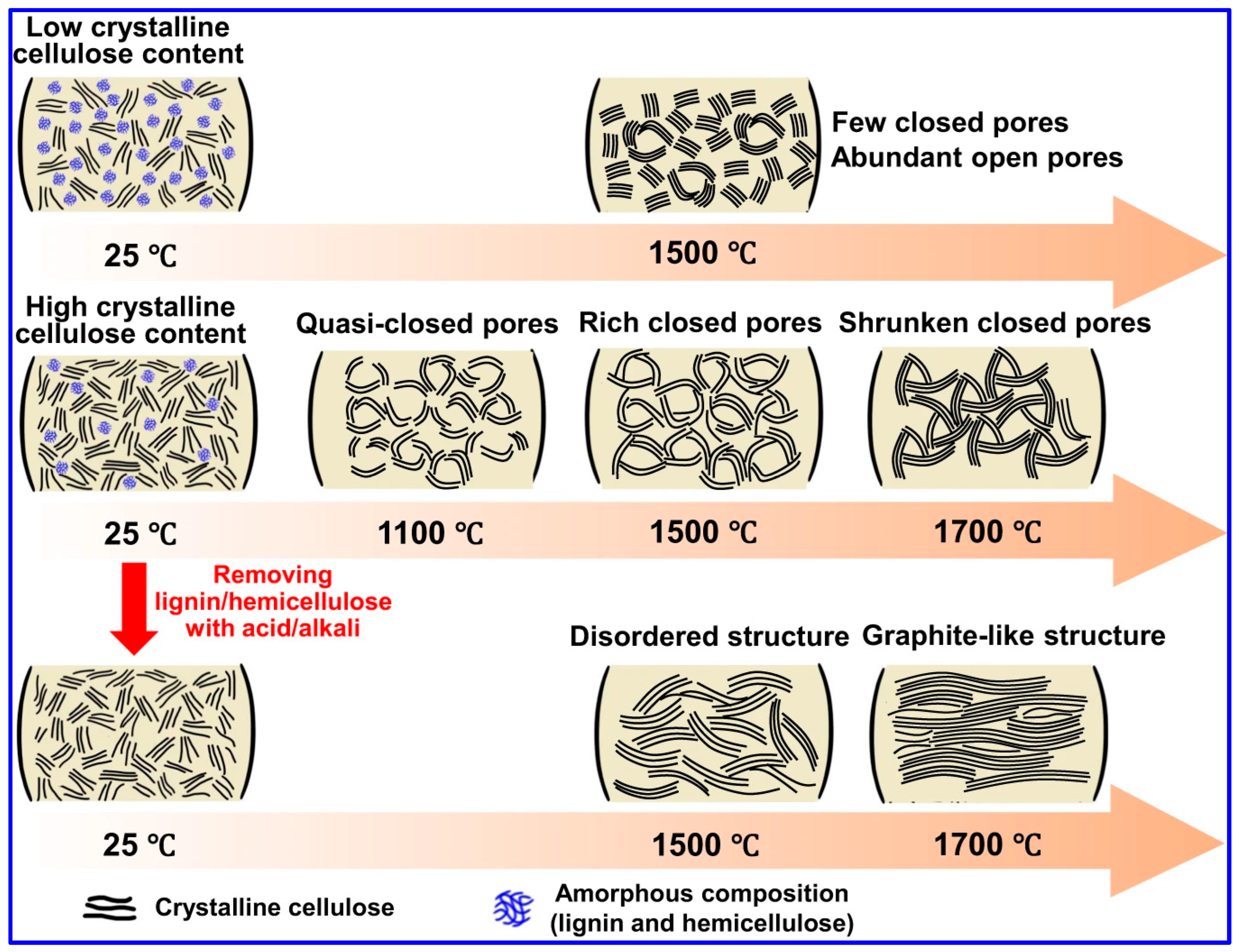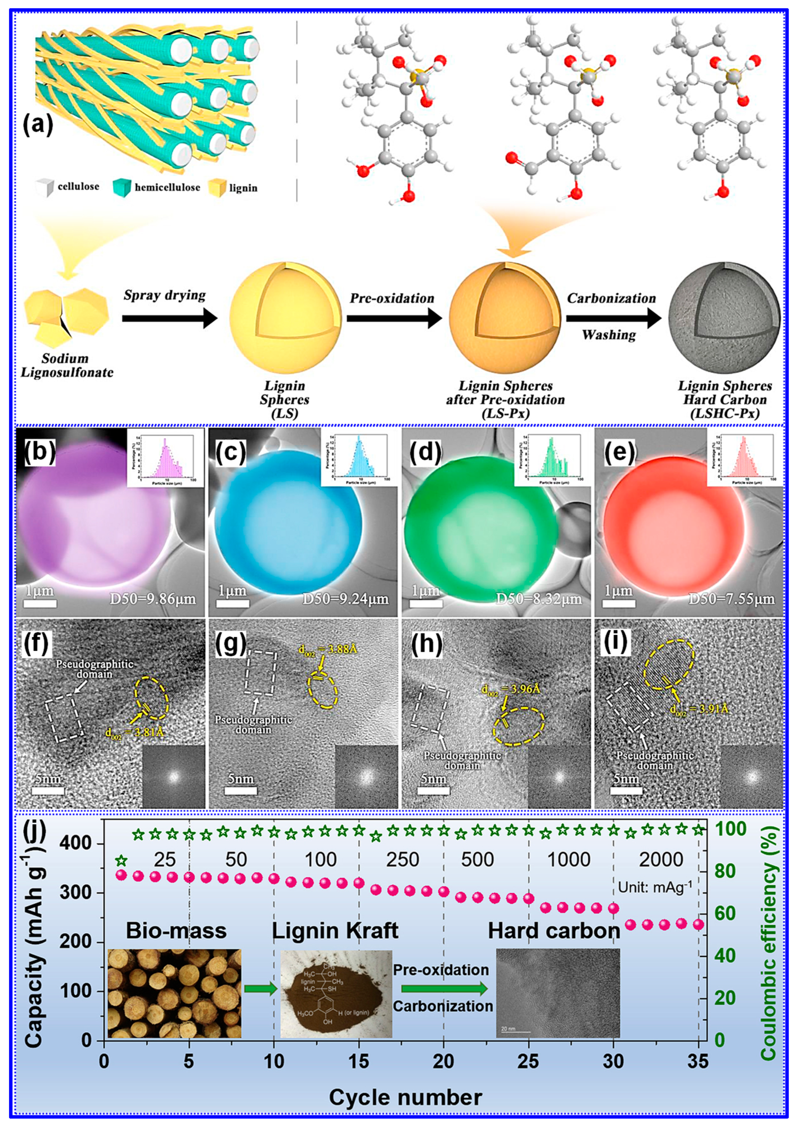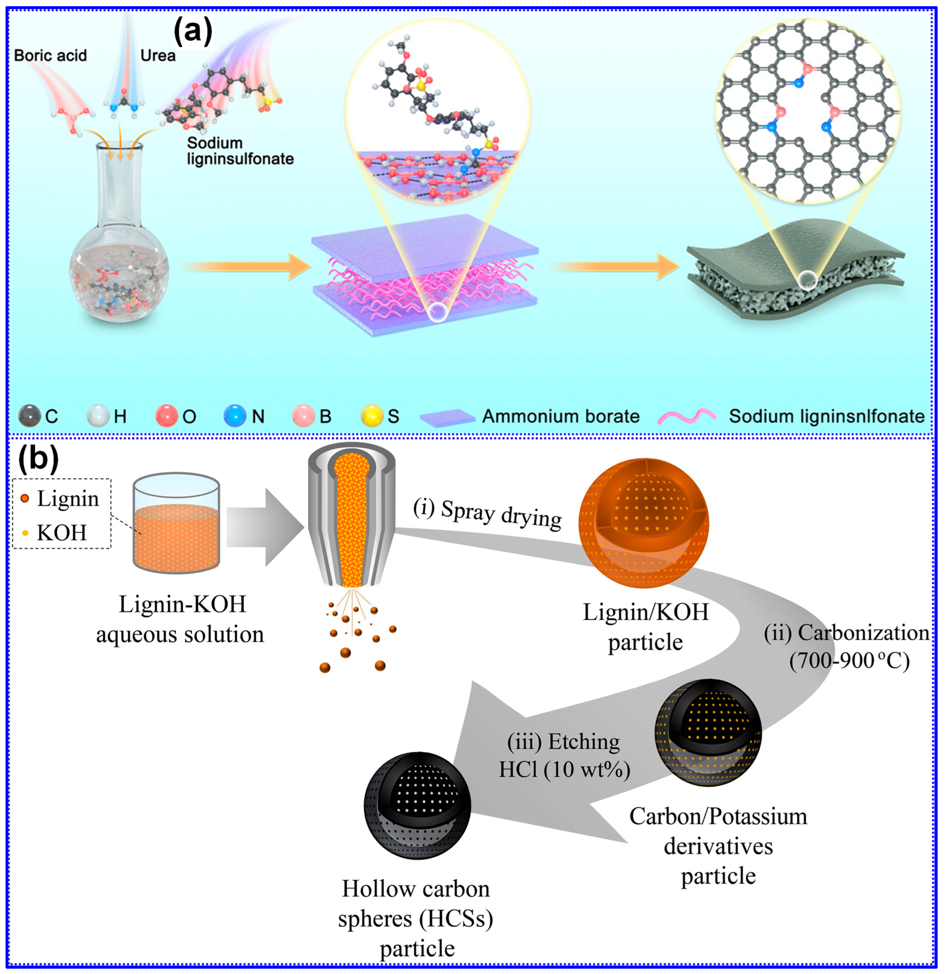 - Homogenization of lignin should be prioritized as a fundamental objective in pretreatment strategies, given the significant influence of lignin’s intrinsic properties on the structural evolution and electrochemical performance of LHCs. However, lignin’s intrinsic heterogeneity, rooted in both its botanical origin and extraction methodology, complicates the comprehensive elucidation of the “property–structure–performance” paradigm and poses challenges for achieving consistent structural control during LHC synthesis. Accordingly, the advancement of large-scale LHC production is contingent upon the reliable availability of lignin with uniform physicochemical characteristics. While current pretreatment methodologies, encompassing purification, morphology regulation, functional group adjustment, heteroatom doping, and feedstock blending, primarily aim to enhance LHC performance, they seldom address lignin uniformity explicitly. To overcome this limitation, there is an urgent need to develop robust and versatile pretreatment techniques capable of yielding lignin with well-defined and reproducible properties. Notably, an emerging strategy inspired by lignin refinery research involves the depolymerization of lignin into monophenols or polyphenols for subsequent phenolic resin synthesis, potentially facilitating the scalable production of advanced, uniform HCs suitable for practical SIB applications.