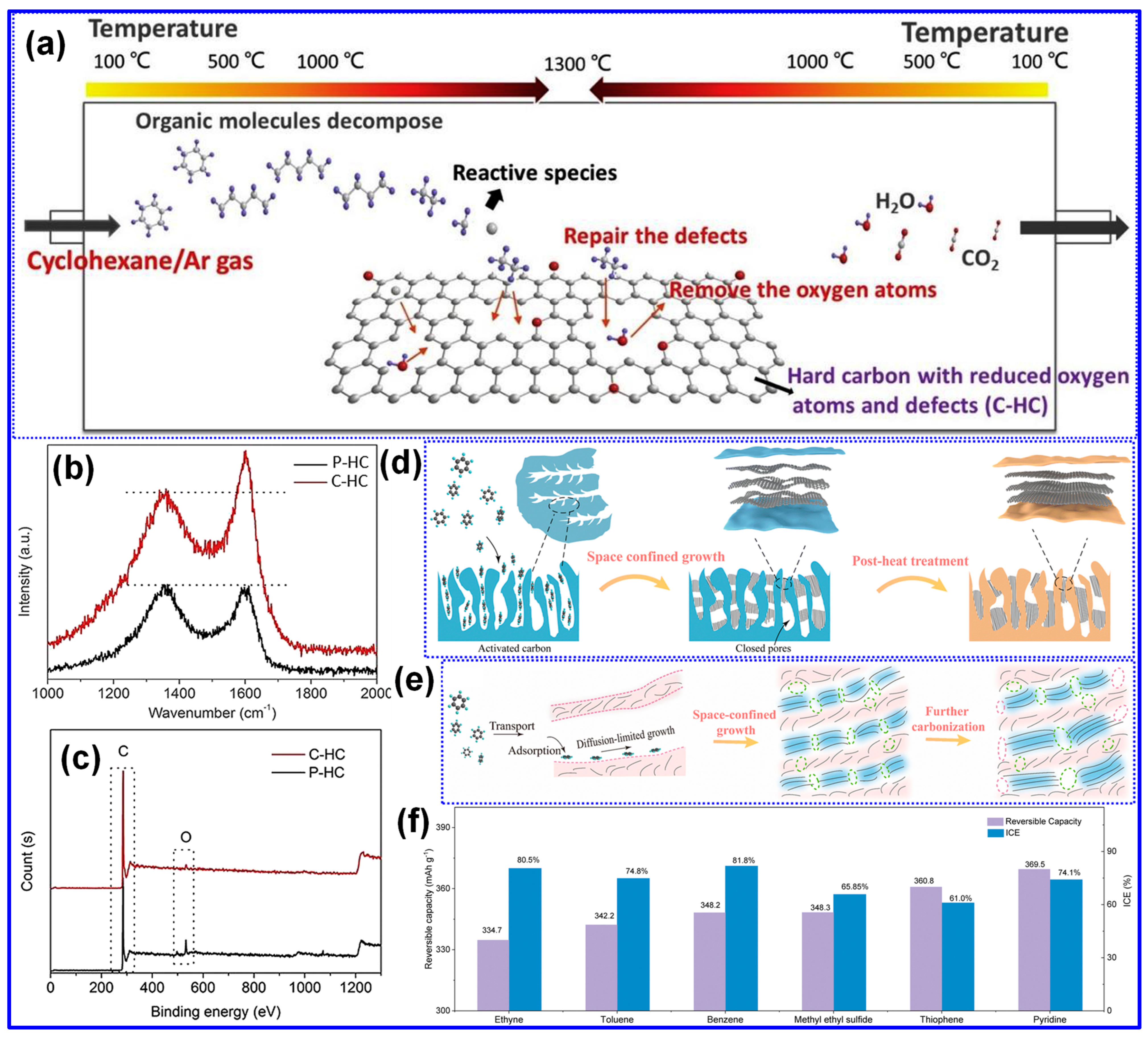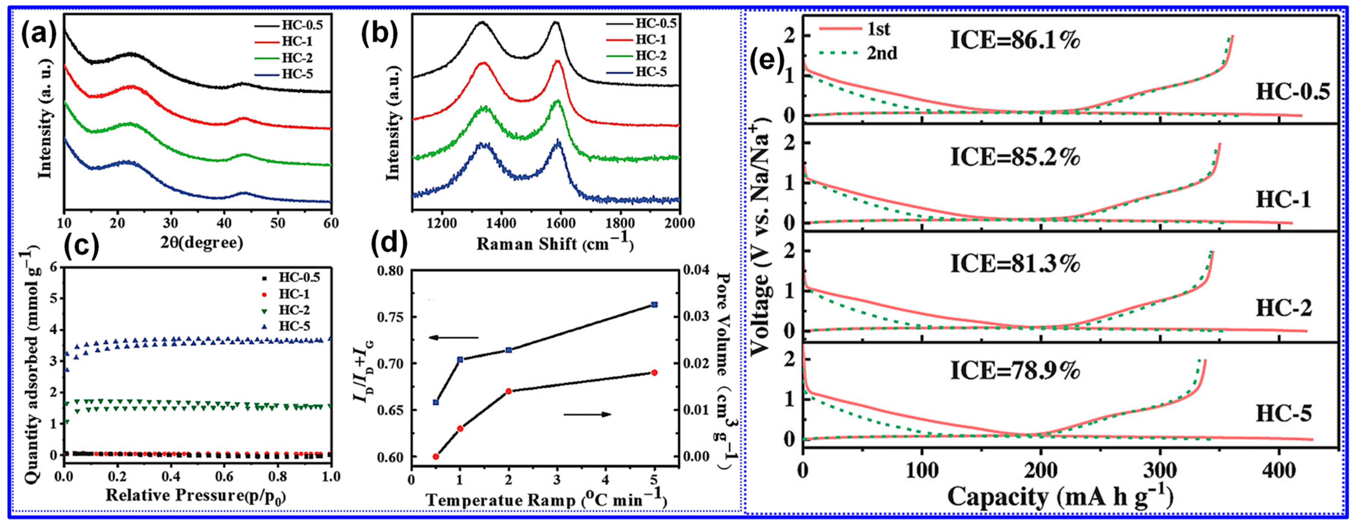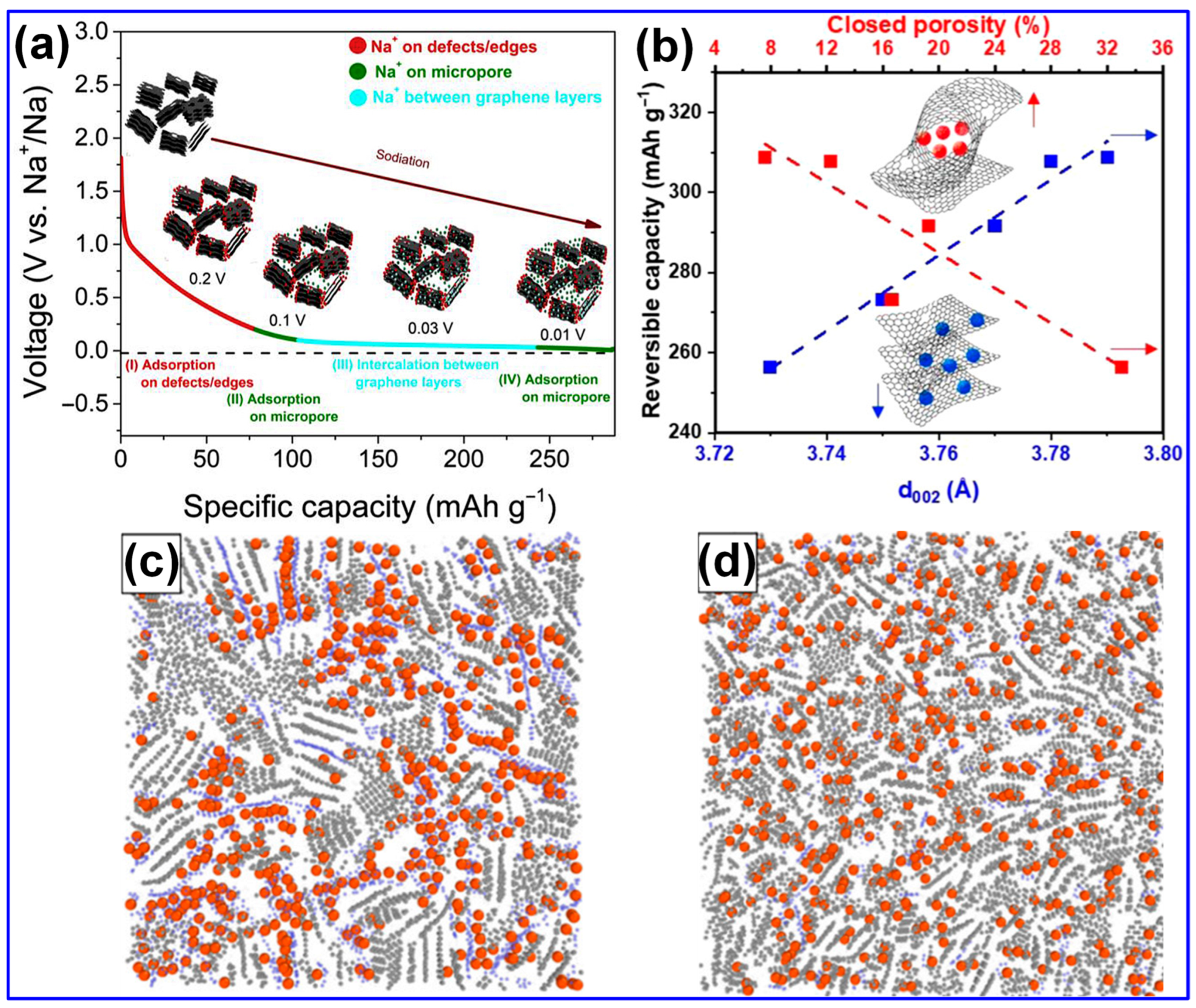 - Resolving the inherent trade-offs among high capacity, accelerated Na storage kinetics, and secure plateau potential remains a pivotal challenge in the development of LHCs for SIBs. Typically, the charge–discharge profile of HCs comprises a slope region at potentials above 0.1 V and a plateau region below this threshold. Na storage within the slope region confers rapid ion kinetics and improved operational safety but suffers from diminished ICE. Conversely, the plateau region provides enhanced capacity and ICE yet is hindered by sluggish kinetics and the heightened risk of Na plating. Attaining an optimal balance between these competing attributes is essential for the rational design of high-performance LHCs. Emerging research indicates that expanding the plateau region, improving its Na transport properties, and elevating its operating potential could present viable pathways to resolve this performance paradox. Realizing this potential, however, necessitates a deeper elucidation of the structure–activity relationships governing plateau behavior. Moreover, as energy storage needs increasingly extend to low-temperature environments, where SIBs offer superior performance relative to LIBs, persistent challenges such as dendrite formation and inadequate rate capability must be addressed. Consequently, advancing the low-temperature electrochemical performance of LHCs remains an imperative research priority.