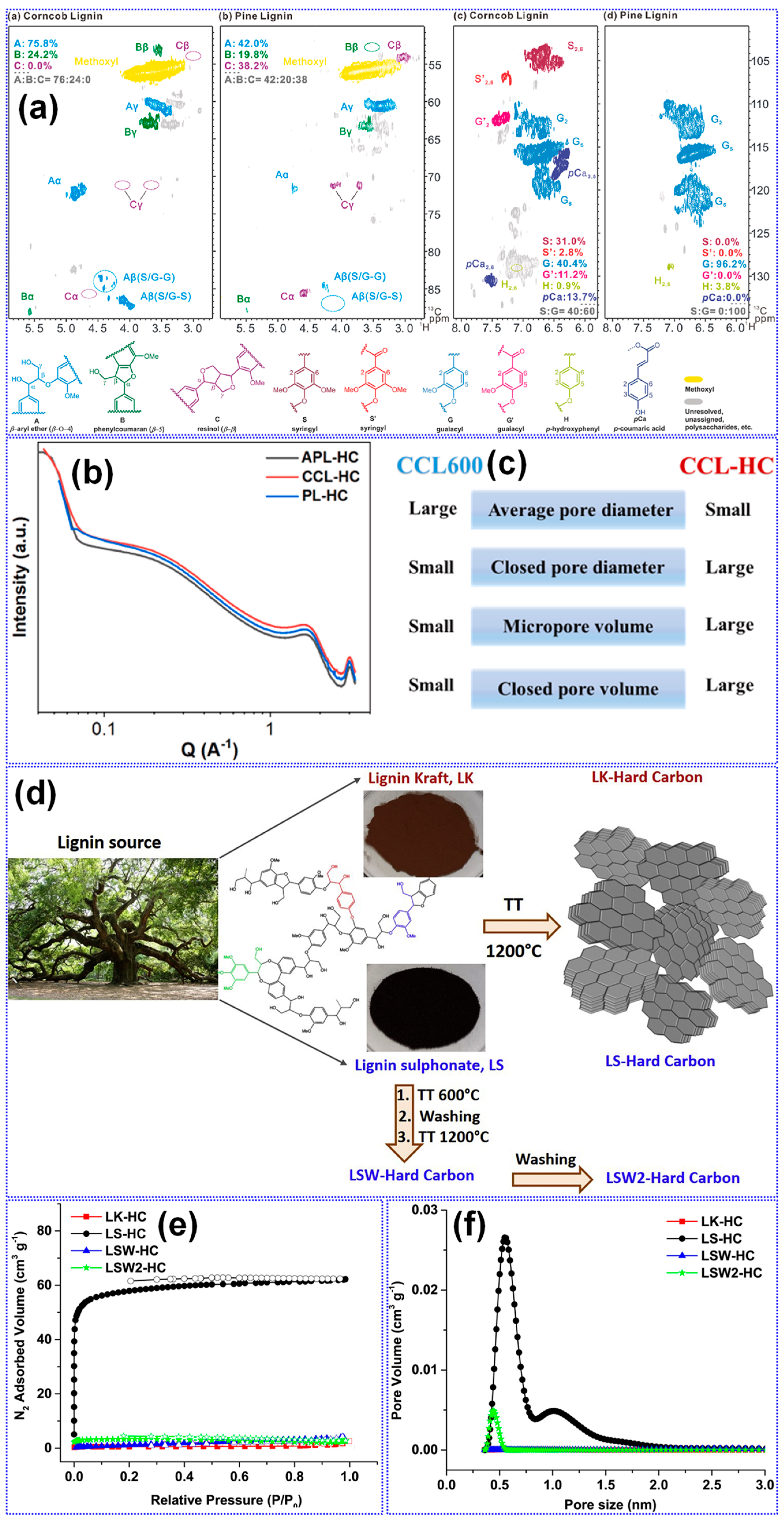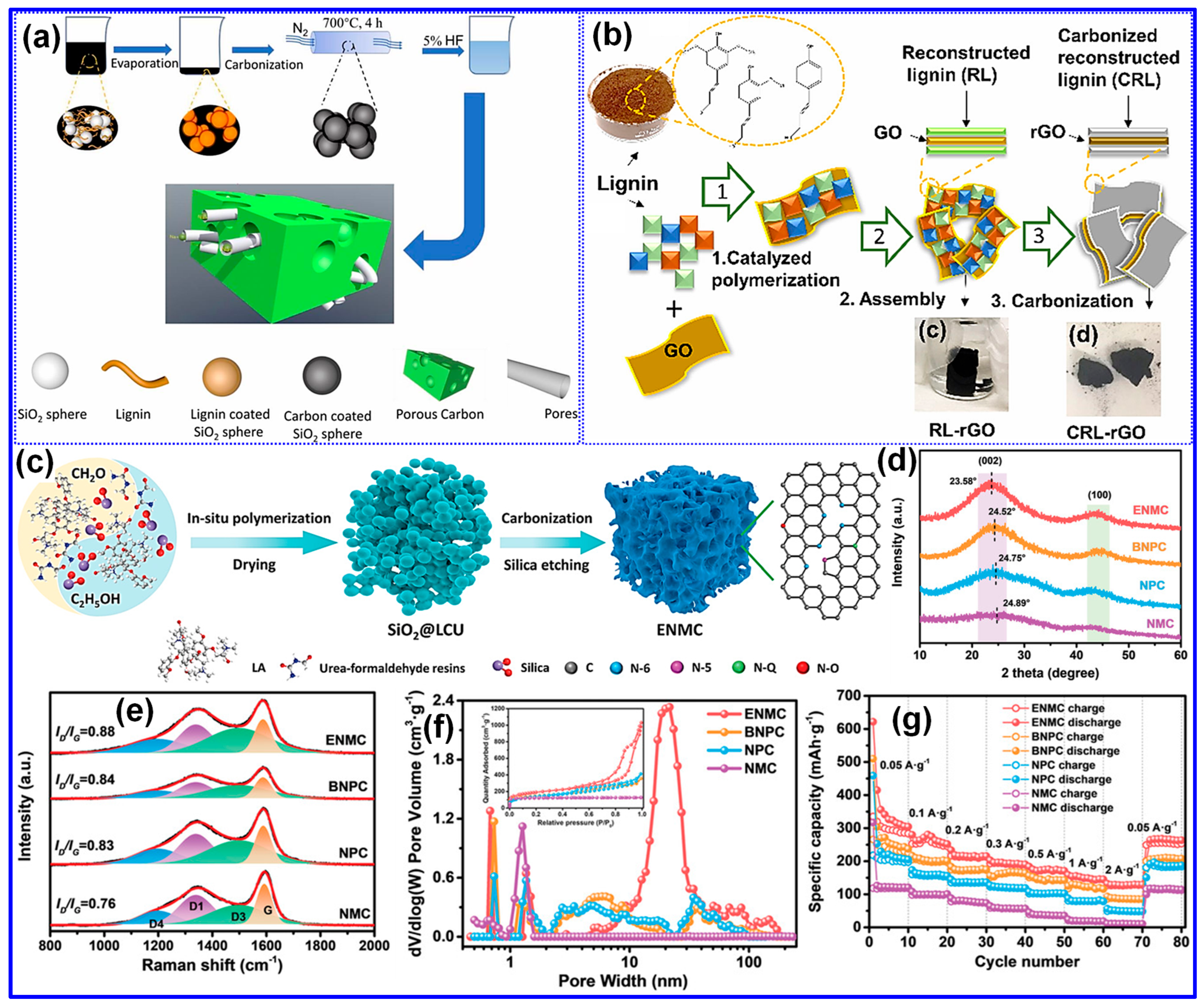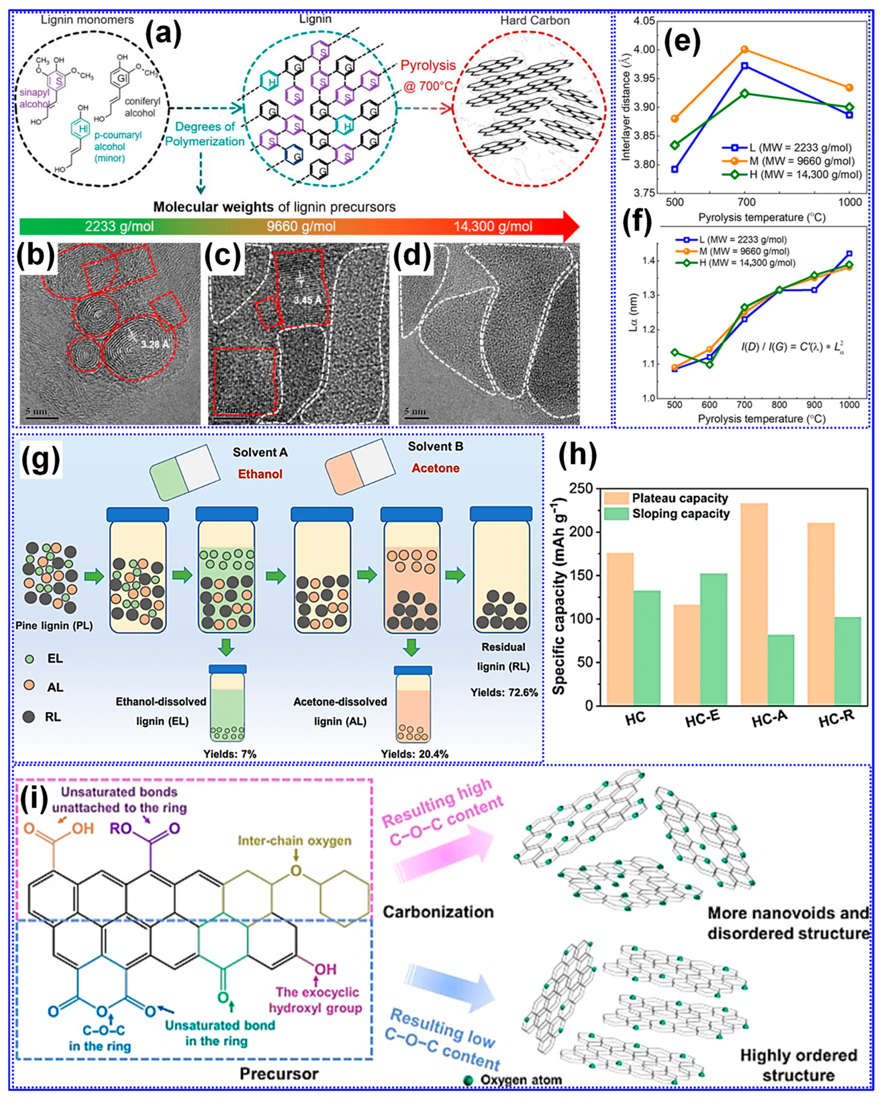 Lignin types (Different molecular weights, oxygenated functional groups, and polarities) | Low MW, high polarity and high carboxyl, phenolic hydroxyl contents | Heating rate: 5 °C min−1; Annealing time: 6 h; Carbonization temperature: 1300 °C | C = 268; Cd = 0.05 | 59.5 | Capacity retention is 82.9% after 100 cycles at 0.1 A g−1 | d002 = 0.399 nm; La = 4.57 nm; Lc = 0.85 nm | Id/Ig = 3.49 | a Pv = 0.0932 SBET = 117.17 | [105] |