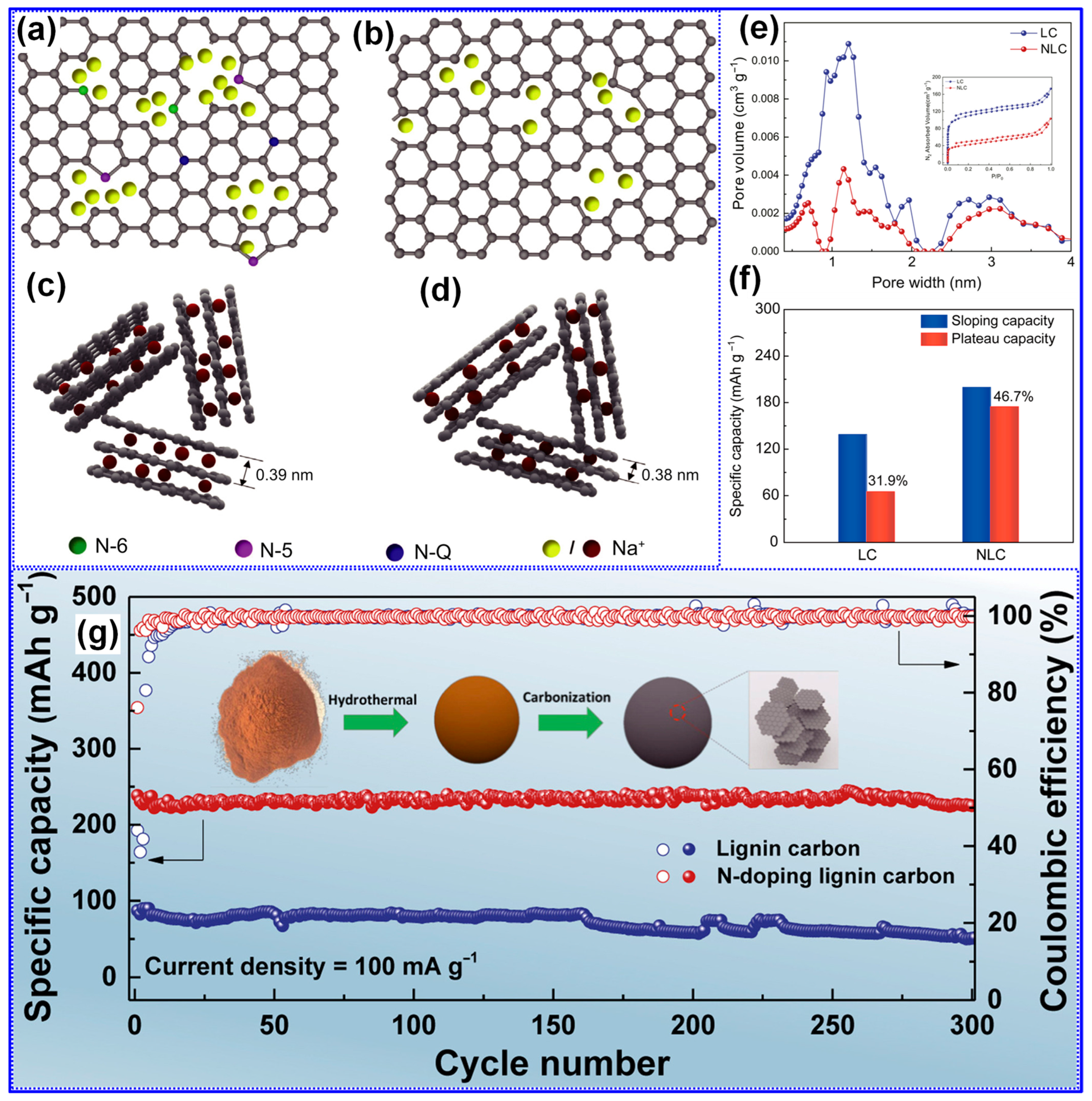 Lignin | Annealing time: 2 h; Carbonization temperature: 1200 °C | C = 203; Cd = 0.025 | 52.7 | Capacity retention is 57.4% after 300 cycles at 0.1 A g−1 | d002 = 0.38; La = 3.804; Lc = 0.592 | Id/Ig = 0.46 | SBET = 531.1 | [113] | |