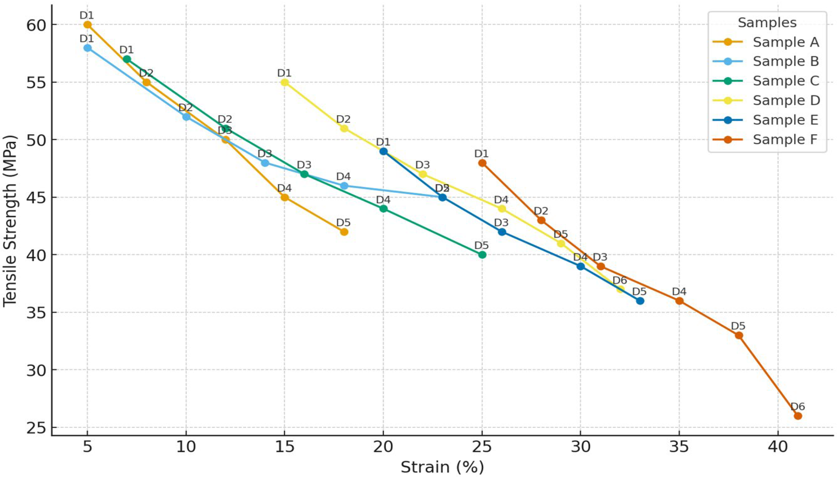 E–F | Irregular surface with visible bubbles and microvoids under light microscopy and SEM | Poor film formation with trapped air or moisture explains low strength and high elongation |