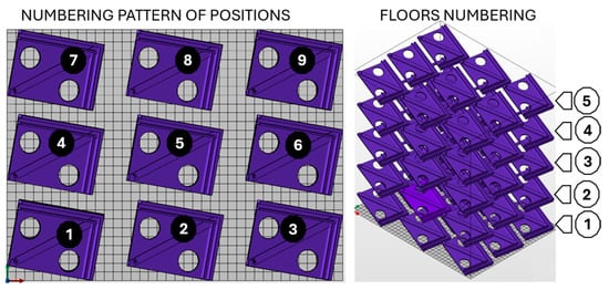 Samples were numbered schematically as shown in Figure 1. The first floor is numbered 1–9, with the first sample being closest to the printer’s coordinate system and the last one being furthest away. The second floor has samples numbered 10–18, using the same system as the first floor, with sample number 10 being closest to the printer’s coordinate system and sample 18 being furthest away. The other floors are numbered similarly.