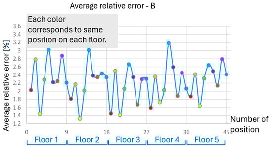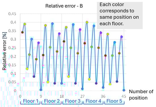 The measured dimension B does not show significant differences in the accuracy of elements in individual floors. However, the greatest accuracy is always achieved by elements located in the corner positions. The worst accuracy is achieved on each floor in the middle row. Everything is evident from Figure 3 and Figure 4. The exact position of parts at all heights (on all floors) is always represented by the same color, which has a recurring effect on accuracy.