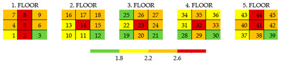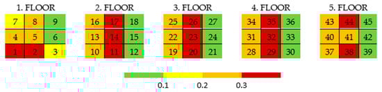 The overall accuracy of individual positions (quadrants) in the printer’s print space can be schematically illustrated in Figure 6, where each table represents one floor and the color indicates the accuracy of the corresponding position.