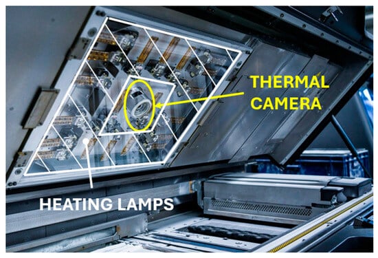 The worst accuracy is for parts located in the central area of the printing space, regardless of height. This effect is caused by the non-uniform distribution of temperature from the lamps. These lamps are adaptively controlled based on recordings from the thermal camera, ensuring a uniform temperature. It is clear that in the middle area, where the thermal camera (and not the lamp, see Figure 7) is located, the control of this temperature is worse, and therefore this position has the worst accuracy. This figure is crucial for understanding the source of heat during the printing process. Generally, the estimated temperature difference between the center and edges is approximately 5–10 °C, leading to local shrinkage variations of 0.05–1%. This gradient is sufficient to cause the observed dimensional inaccuracies of 0.1–0.2 mm in central positions.