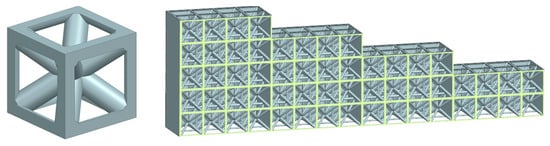 In this part of the work, a set of test samples was created to determine the optimal approach to designing the filling of internal cavities and penetrations in the envelope surface of the part for removing excess powder. A BCC type lattice was chosen for the internal structure, as shown in Figure 8, which can be oriented arbitrarily.