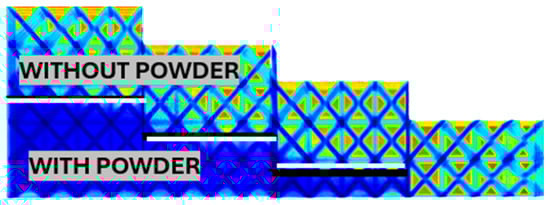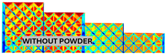 The problem with removing the internal powder from parts showed a relationship between relative density and maximum cleanable thickness. At low densities (ρ ≈ 0.07), complete powder removal was achievable through up to five BCC layers, while at higher densities (ρ ≈ 0.39–0.47), only 1.5–1.7 layers could be fully cleaned. These results are consistent with findings in lattice manufacturing studies [46,47]. The industrial implication is that, for closed MJF lattices, vent design must be coupled with density and layer-thickness limitations to avoid trapped powder compromising mass reduction goals. The research has to be also focused on different types of lattice structures in the future. The BCC was chosen, because it is the most often used type of the lattice cell.