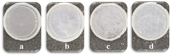 2O 75–81 wt.%) with the following compositions: (a) 1/7, (b) 2/7, (c) 3/7, and (d) 3/11 (PVA/PEGDA wt.%).