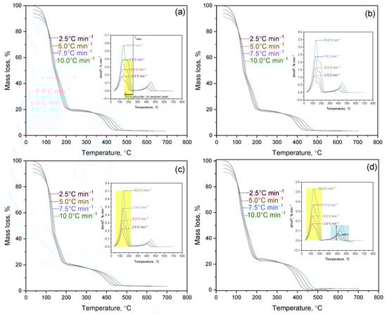 Figure 5d), the decrease is more gradual. Such heterogeneity confirms the multistage nature of the decomposition process: each stage proceeds via its own mechanism. A more detailed comparison of samples (c) and (d) (