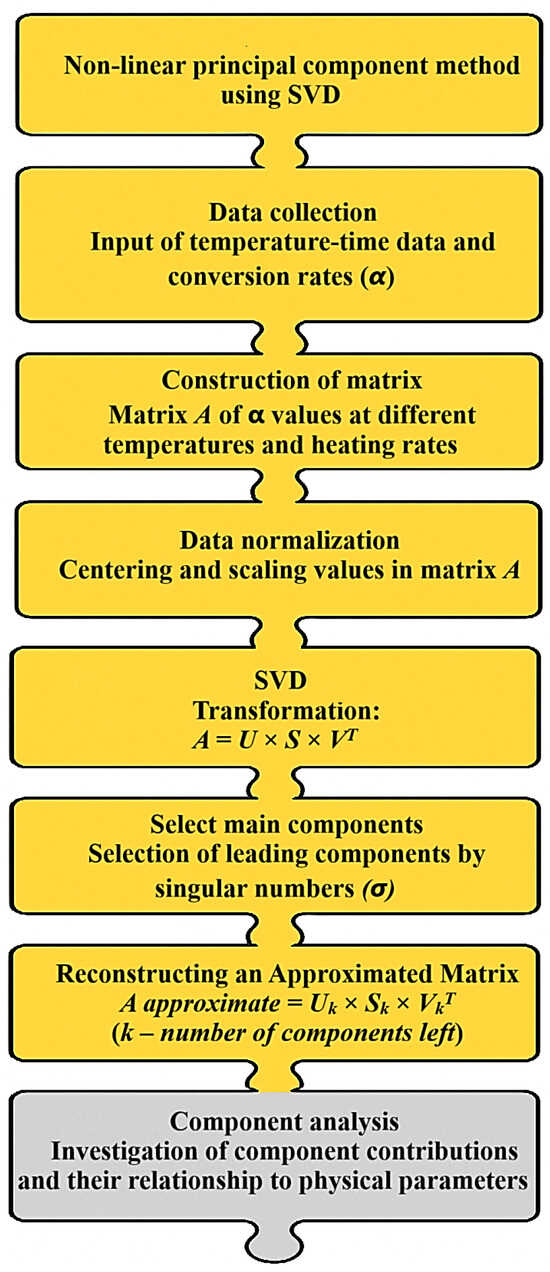 Figure 6 presents a schematic diagram of the PCA-based analysis, illustrating the formation of the initial data matrix, SVD, selection of principal components, and evaluation of their contribution to the overall reaction process—that is, how the method extracts individual reaction mechanisms from the experimental data.
