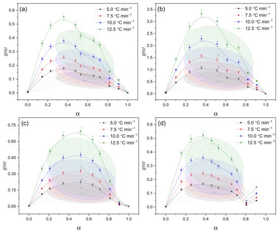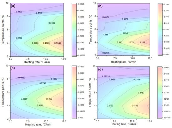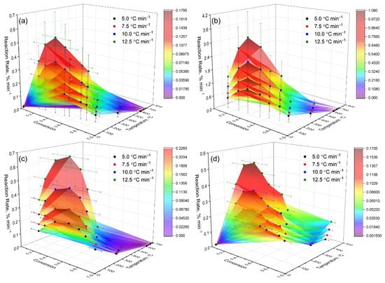 Figure 7a–d show three-dimensional dependencies of the reaction rate (dα/dT) on temperature (T) and conversion degree (α) at heating rates of 5.0, 7.5, 10.0, and 12.5 °C·min