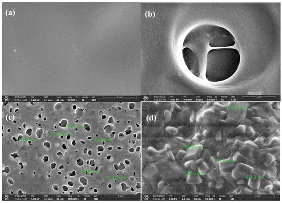 Figure 9) have a direct impact on the reaction kinetics and activation energy. At the early stage (150 °C), the dense structure of the composition inhibits the diffusion of volatile products, thereby requiring higher activation energy to initiate destructive reactions—i.e., the material must absorb more heat before decomposition begins. In the range of 250–450 °C, the formation of gas bubbles and the development of nanoporous domains significantly enhance heat transfer and gas diffusion, lowering the energy barrier and accelerating the decomposition of the polymer matrix. As the sample becomes more porous, it also becomes more reactive.