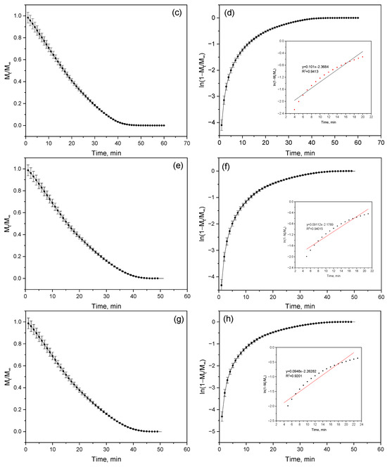 Figure 11e,f), respectively. Interestingly, samples (c) and (d) exhibit identical slope values; however, their diffusion coefficients differ slightly—(2.05 ± 0.05) × 10