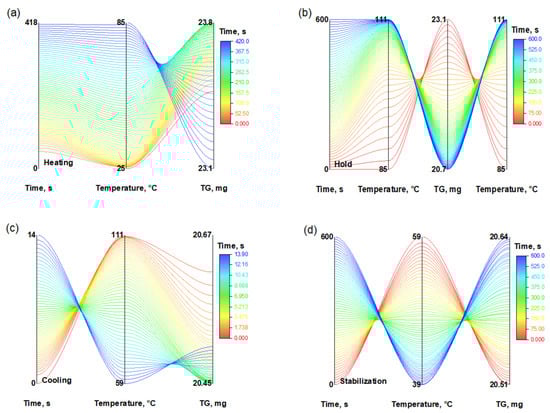 The color scale represents the duration of the experiment. The graphs illustrate the decrease in sample mass at each stage, reflecting the degradation and evaporation processes occurring during the thermal cycle.