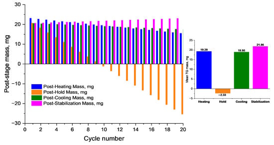 In addition to kinetic and diffusion analysis, the thermal stability of the PVA/PEGDA (3/11) hydrogel under repeated thermal exposure was evaluated. Thermogravimetric analysis (TG) was used to monitor mass changes during 20 consecutive thermal cycles, each consisting of heating (up to 100 °C), isothermal holding, cooling, and subsequent stabilization at 30 °C. As shown in