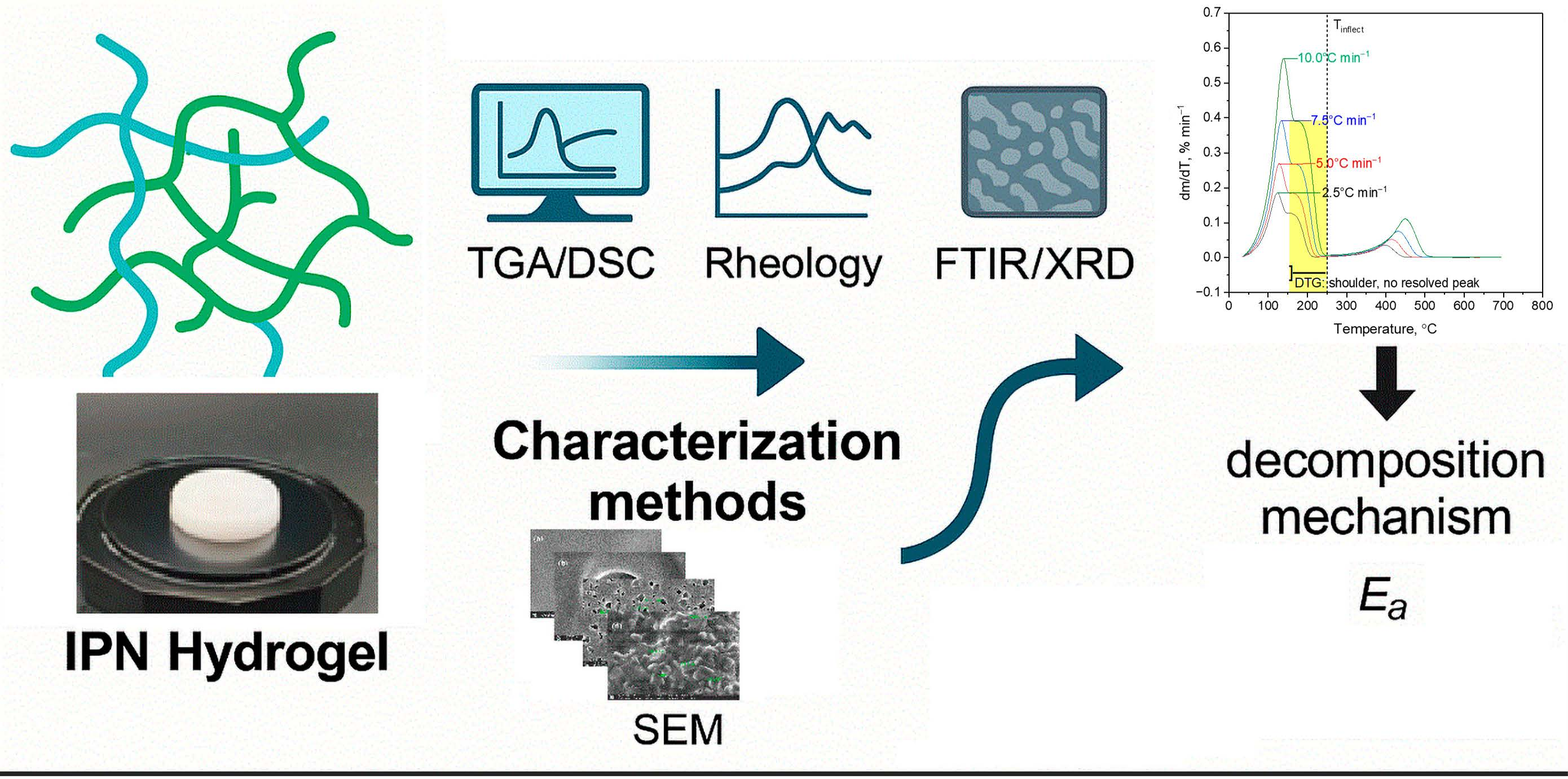 In the present study, a comprehensive approach was applied to the kinetic analysis of the thermal decomposition of IPN hydrogels, combining both model-free and model-based methods (i.e., approaches that either assume or do not assume a predefined reaction mechanism). Each selected method served a specific analytical purpose aimed at constructing an integrated understanding of the degradation mechanisms: