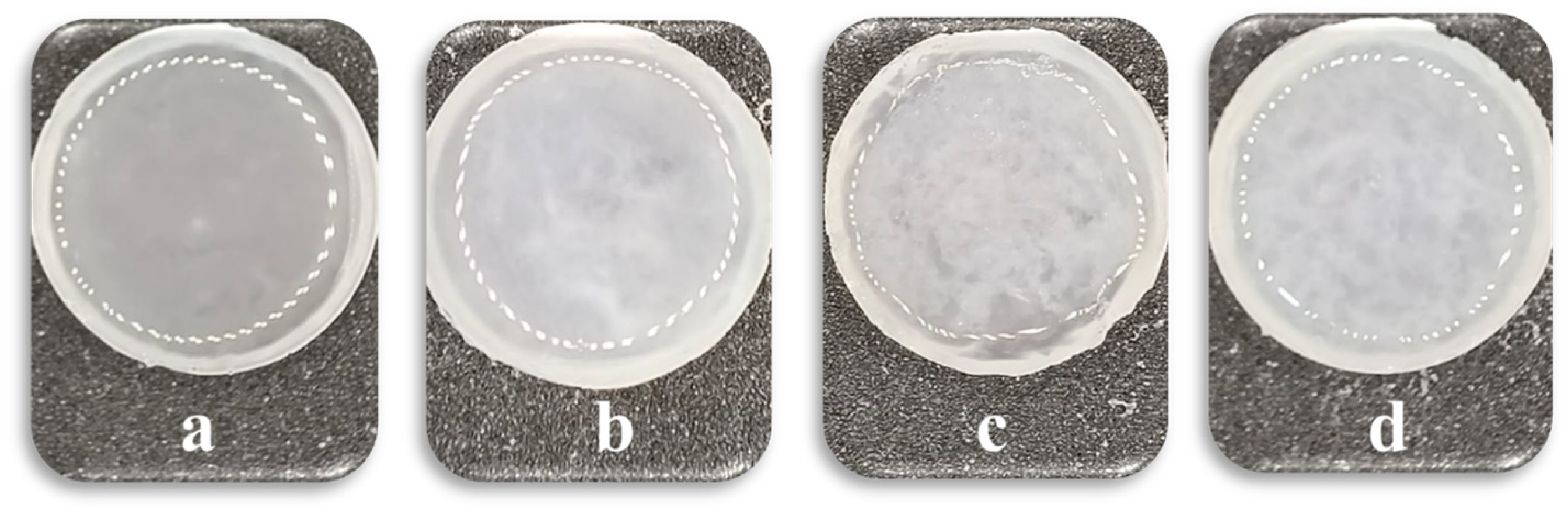 2O 75–81 wt.%) with the following compositions: (a) 1/7, (b) 2/7, (c) 3/7, and (d) 3/11 (PVA/PEGDA wt.%).