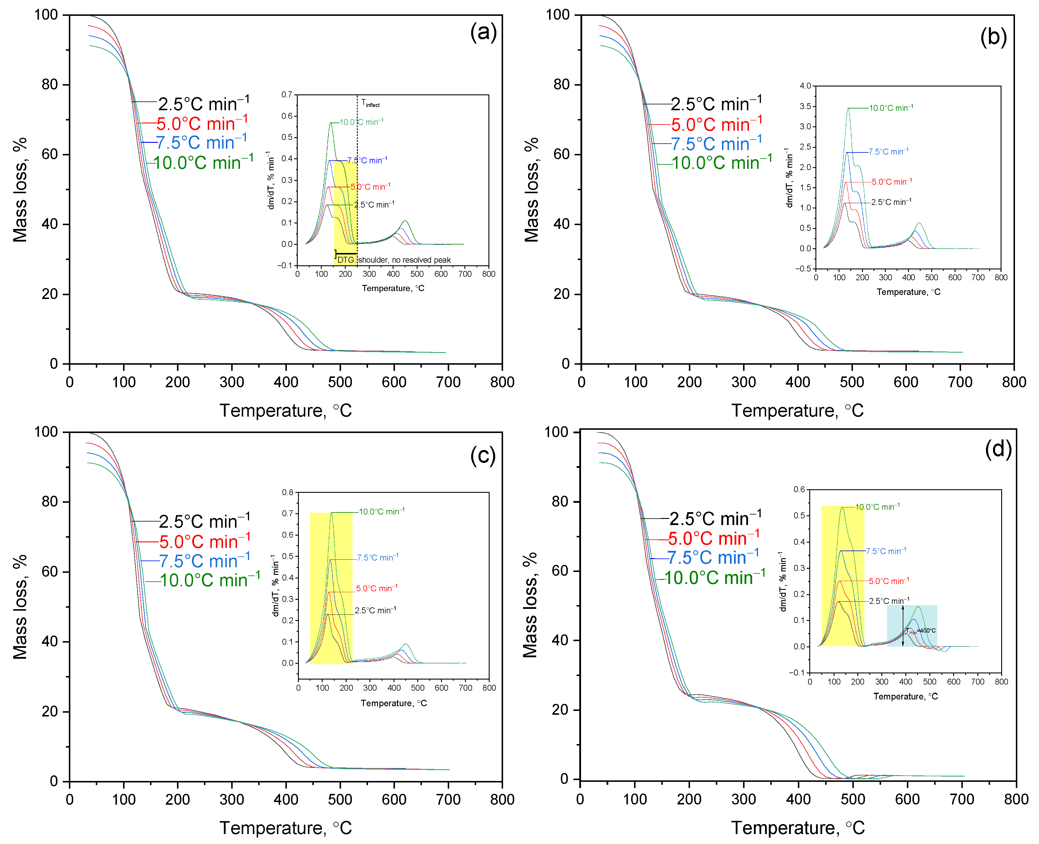 Figure 5d), the decrease is more gradual. Such heterogeneity confirms the multistage nature of the decomposition process: each stage proceeds via its own mechanism. A more detailed comparison of samples (c) and (d) (