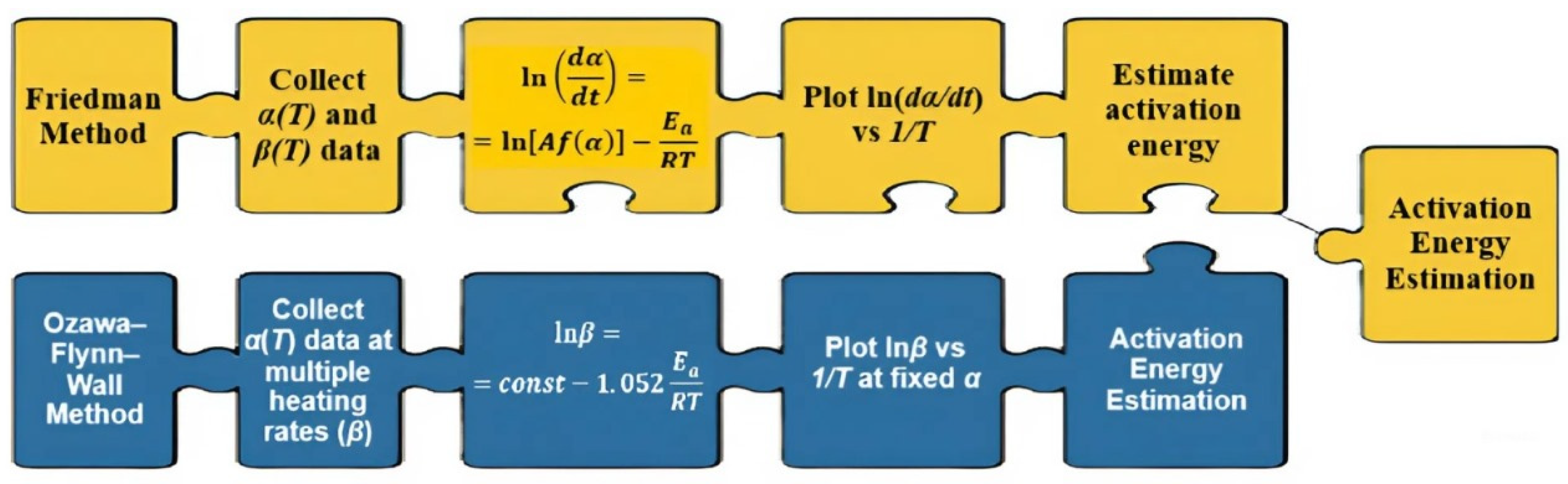 Figure 4), which illustrates the distinctions between the differential (Friedman) and integral (Ozawa–Flynn–Wall, OFW) approaches, the results of their application to the experimental data are presented below.