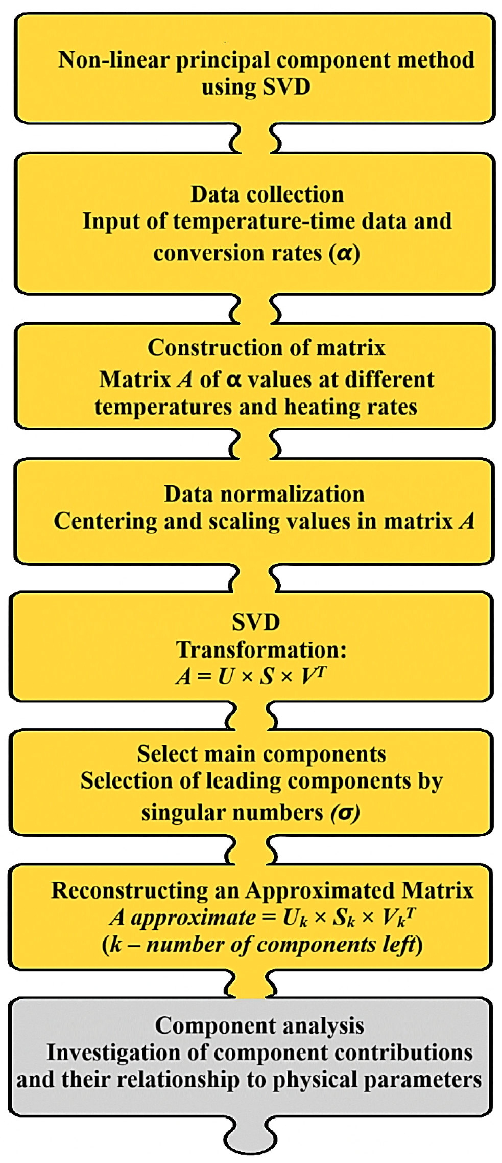 Figure 6 presents a schematic diagram of the PCA-based analysis, illustrating the formation of the initial data matrix, SVD, selection of principal components, and evaluation of their contribution to the overall reaction process—that is, how the method extracts individual reaction mechanisms from the experimental data.